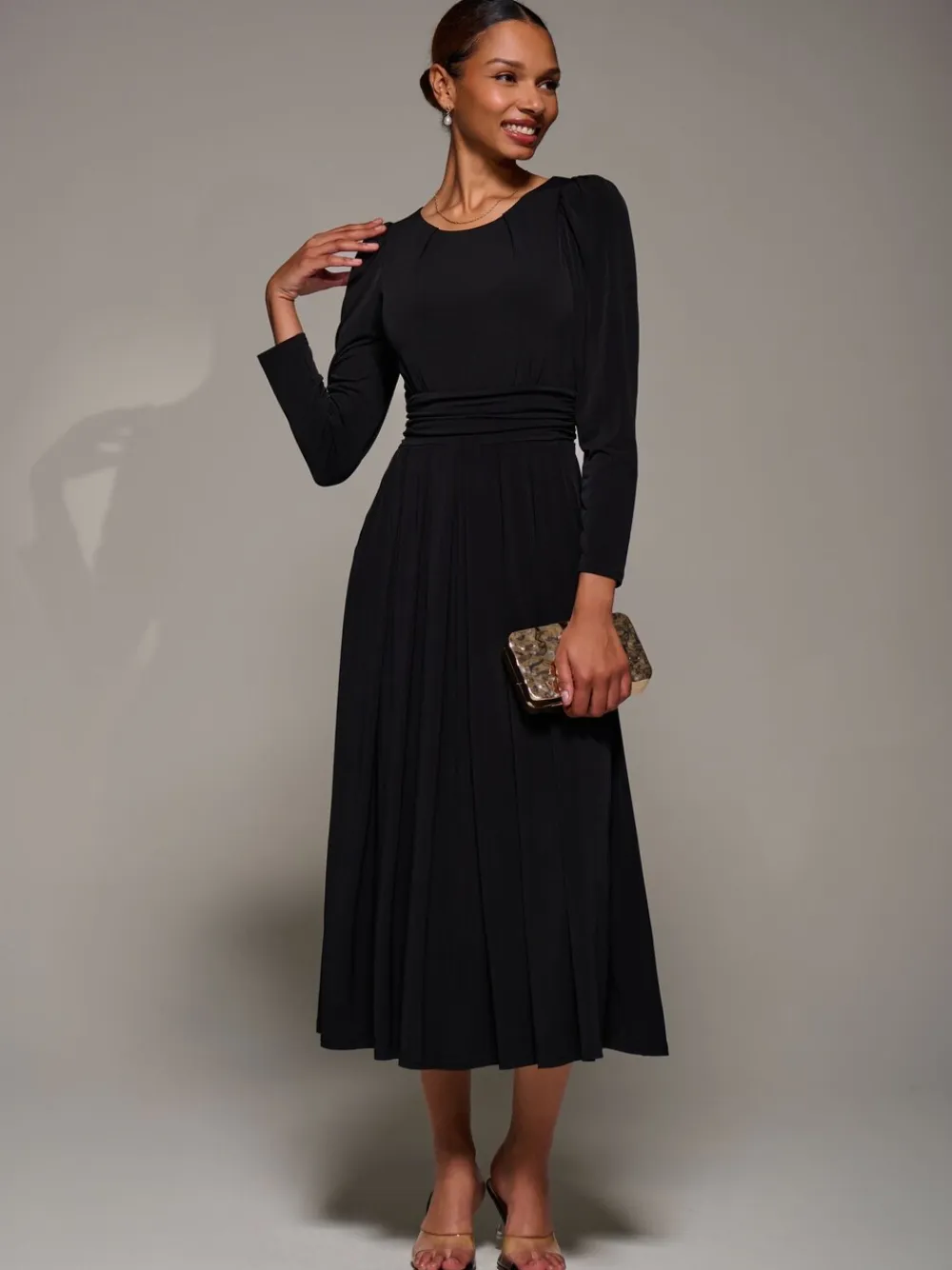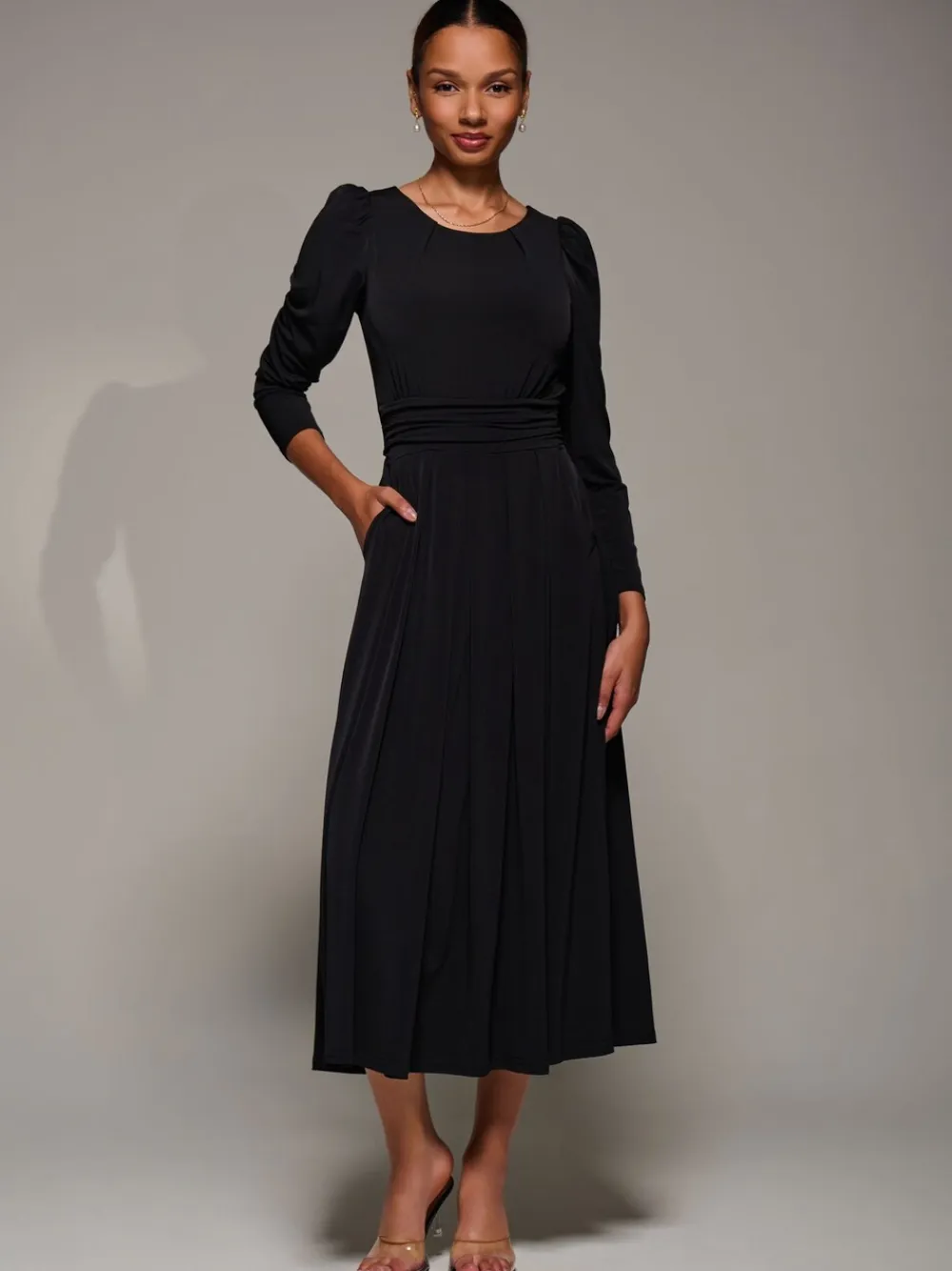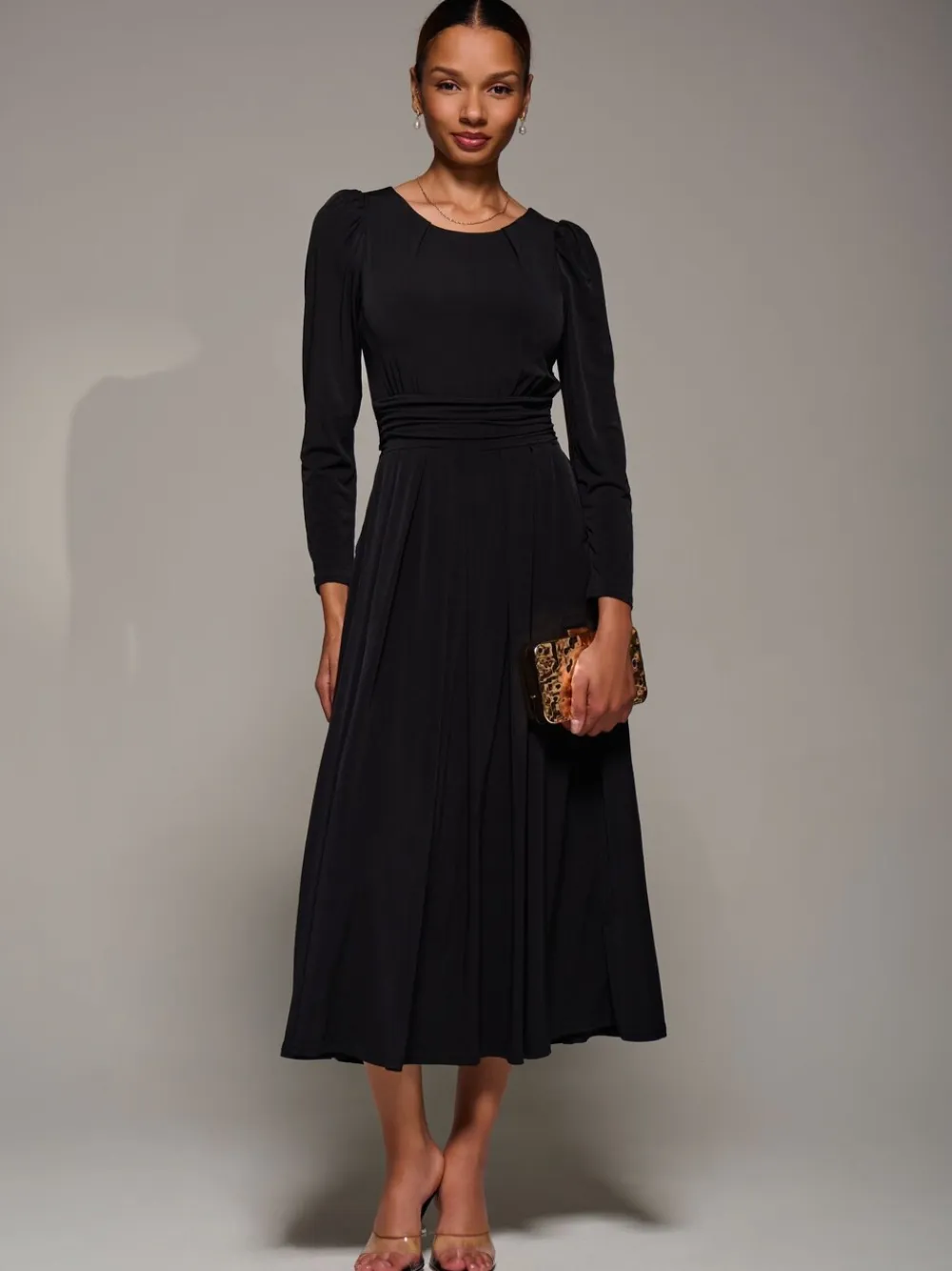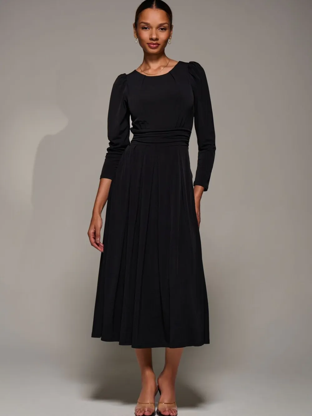 The Puff Long Sleeve Jersey Maxi Dress by Jolie Moi is made from soft jersey fabric. It features a classic round neckline, long puff sleeves, and two discreet side pockets. The dress has a tie detail at the back. The waistband offers gentle gathering at the sides, adding a subtle drape. The skirt is finished with soft pleats for added movement. Model’s height- 170cm, and wears size 8, length 125cm. Machine washable. 92% Polyester, 8% Elastane.