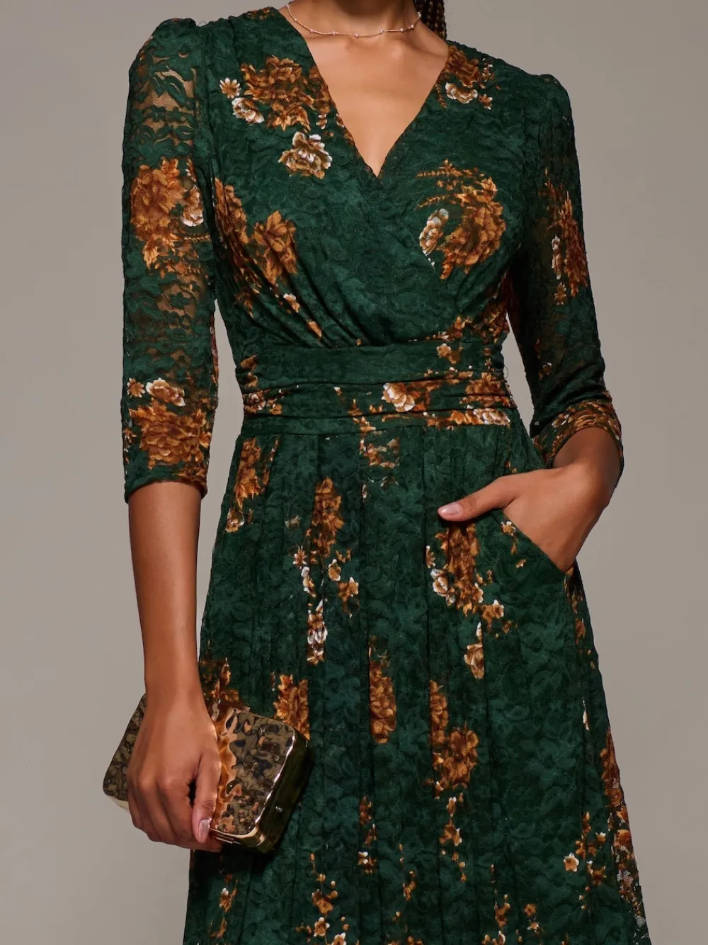 Three Quarter Sleeve Printed Lace Maxi Dress by Jolie Moi features a flattering wrap-front V neckline, a concealed zip at the back for a seamless fit, and two convenient pockets. Gentle pleats around the waistband create subtle shaping, enhancing the silhouette with an elegant touch. The model is 170cm and wears a size 8. Length: 128cm. Machine washable. 92% Nylon, 8% Elastane.