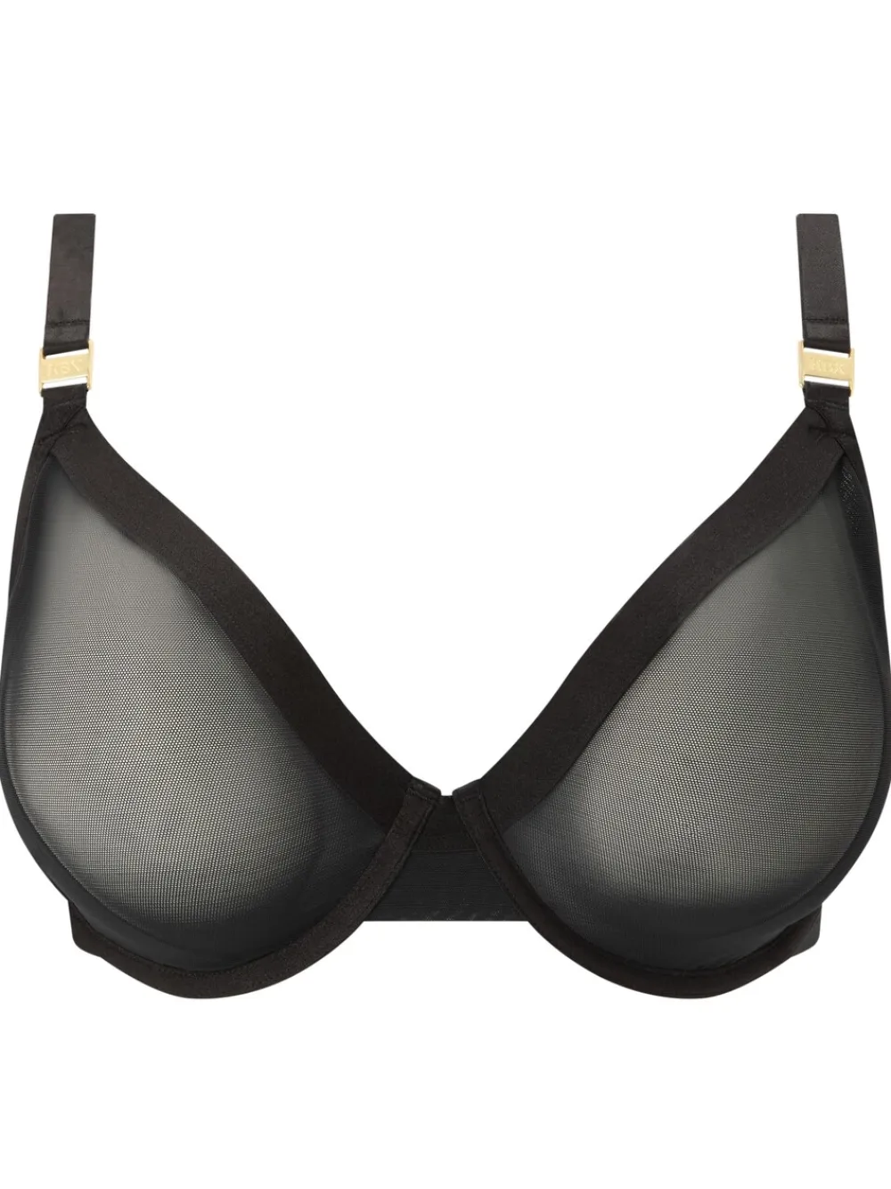 Introducing Zadie by KBX, a plunge bra in a black soft-touch mesh fabric. Non-padded with semi-sheer cups and wired to create an uplifted and natural shape. Detailed with brushed champagne gold-toned hardware, the shoulder straps have an adjustable clasp to convert to a racerback style for multi-wear. Nipple covers have been worn in this image. Hand wash only. Main 60% Nylon, 40% Elastane. Cup Lining 90% Nylon, 10% Elastane.