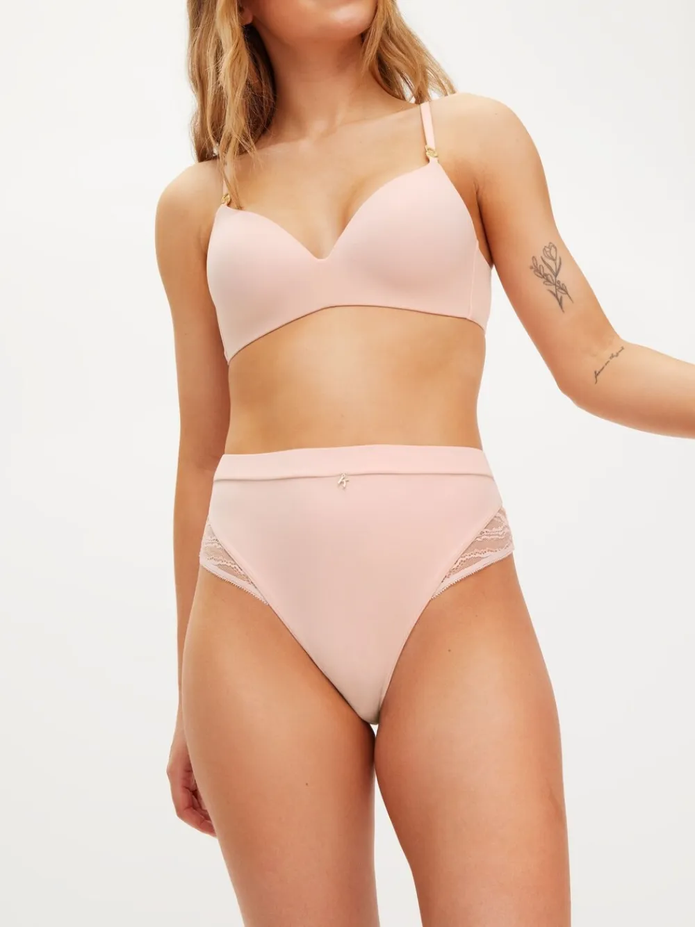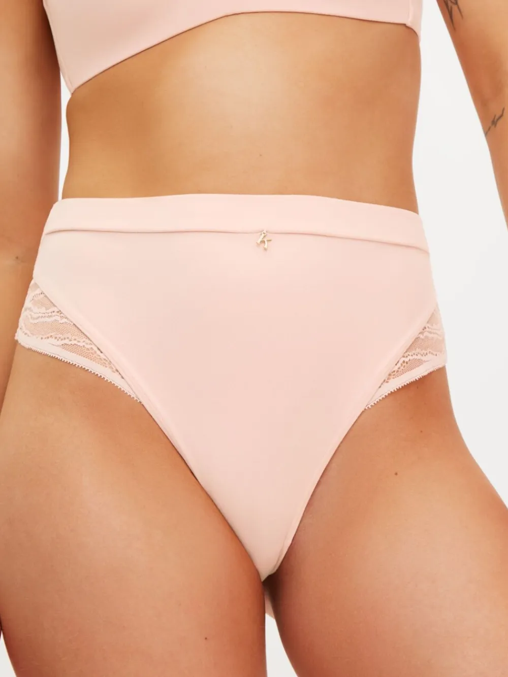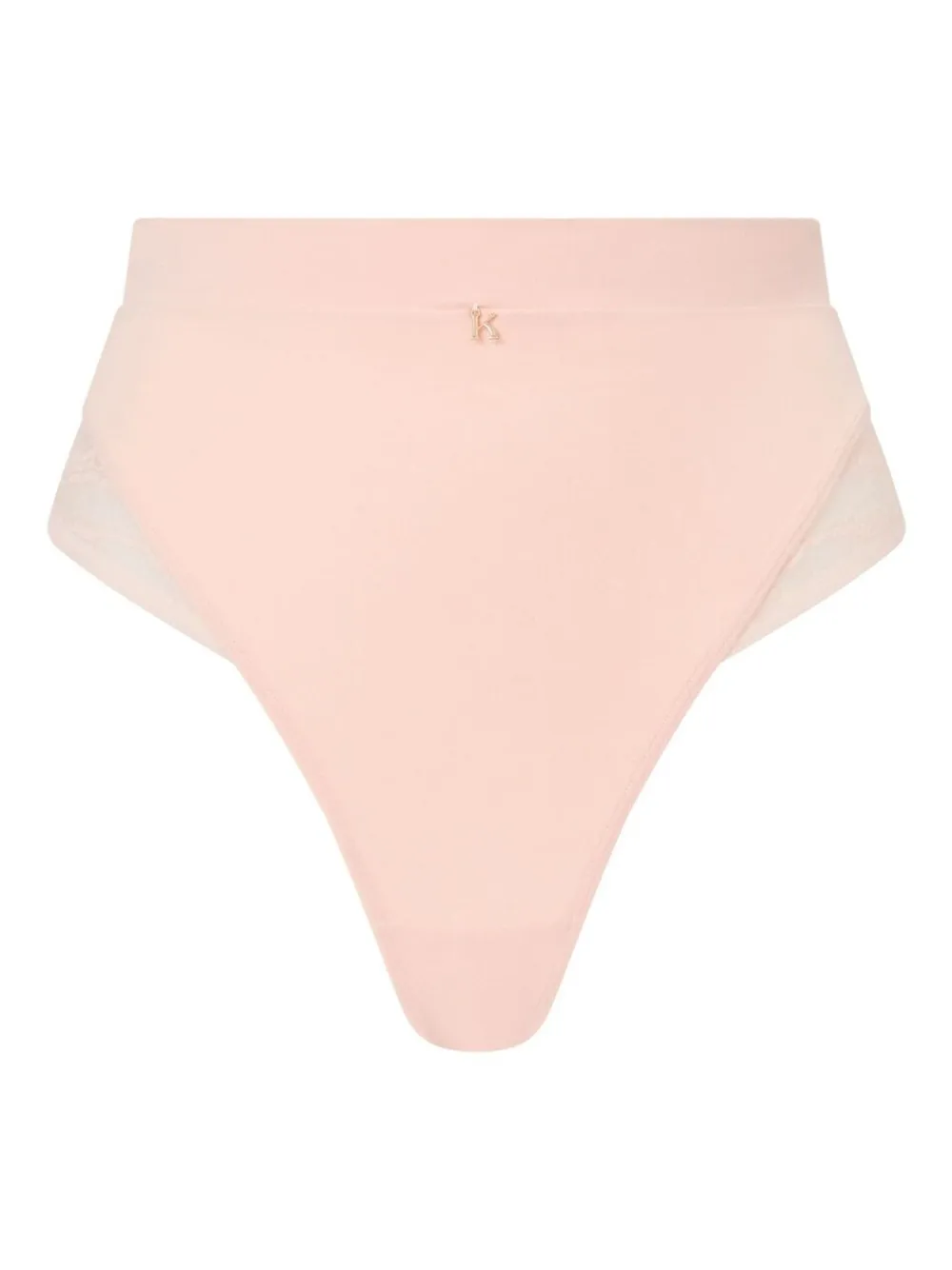 The nude Charlotte high-waisted thong by KBX seamlessly blends soft brushed microfiber with animal-pattern lace. With a flattering and comfortable high-rise shape, the elasticated waistband fits close to your body, and the lace around the hips ensures the thong is invisible under your outfit. Decorated with subtle brushed gold hardware at the centre front. Machine washable. Main 82% Nylon, 18% Elastane. Lace 92% Nylon, 8% Elastane. Lining 100% Cotton.