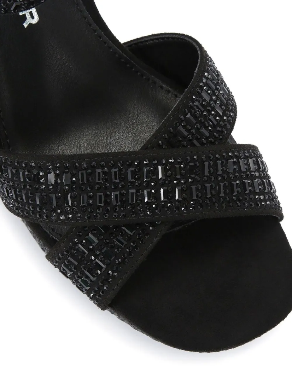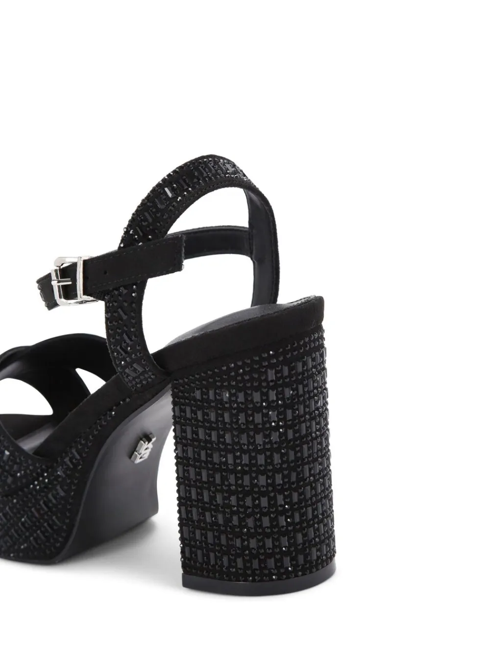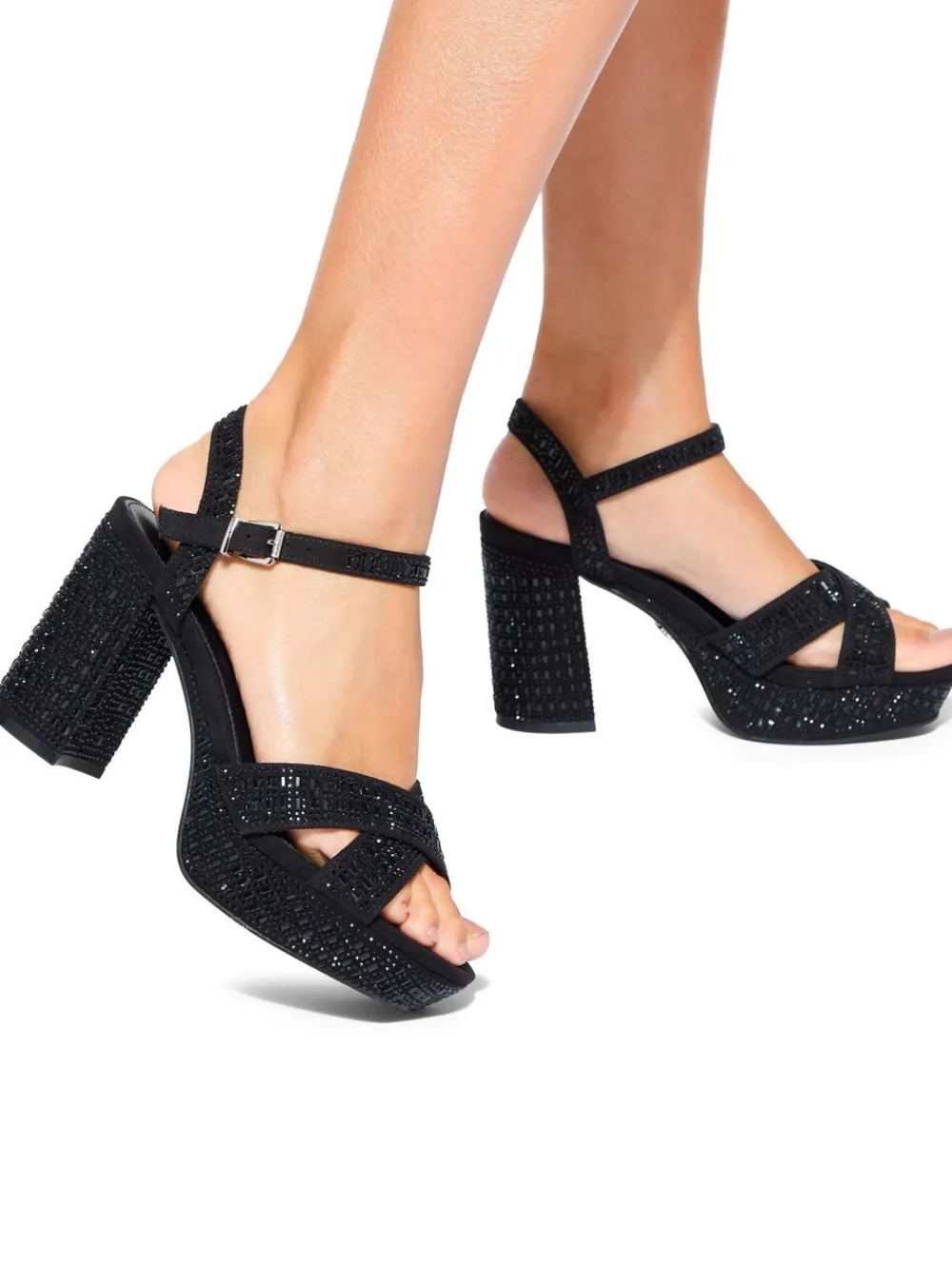 The Fleur Platform bling block heel features a black fabric upper embellished with black crystals. The ankle strap is fastened with a silver buckle. Heel height: 6.5cm Heel height 9.5cm. Main – 100% Textile. Lining – 100% Textile. Sock – 100% Synthetic.