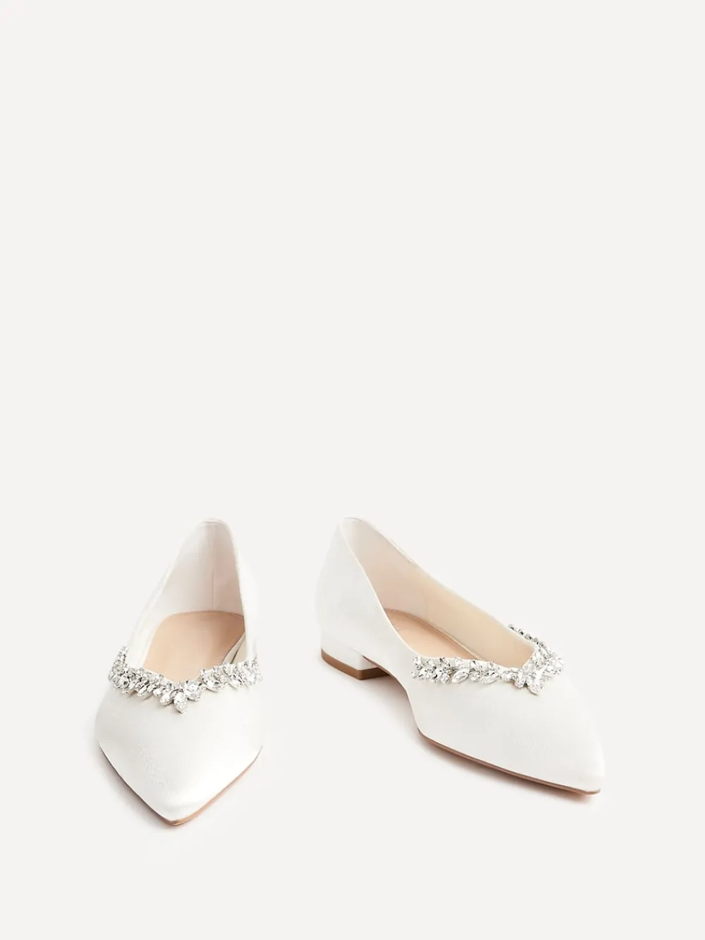 Elevate your wedding look with our Endless bridal ballet flats. Designed with a sleek pointed toe and a stunning trim detail, they add a touch of sophistication to any bridal look. The subtle 1.5 cm block heel provides a gentle lift, while the cushioned insole ensures lasting comfort. Perfect for brides seeking a chic alternative to heels. Main – 100% Other fibres. Lining – 100% Other fibres. Sock – 100% Other fibres.