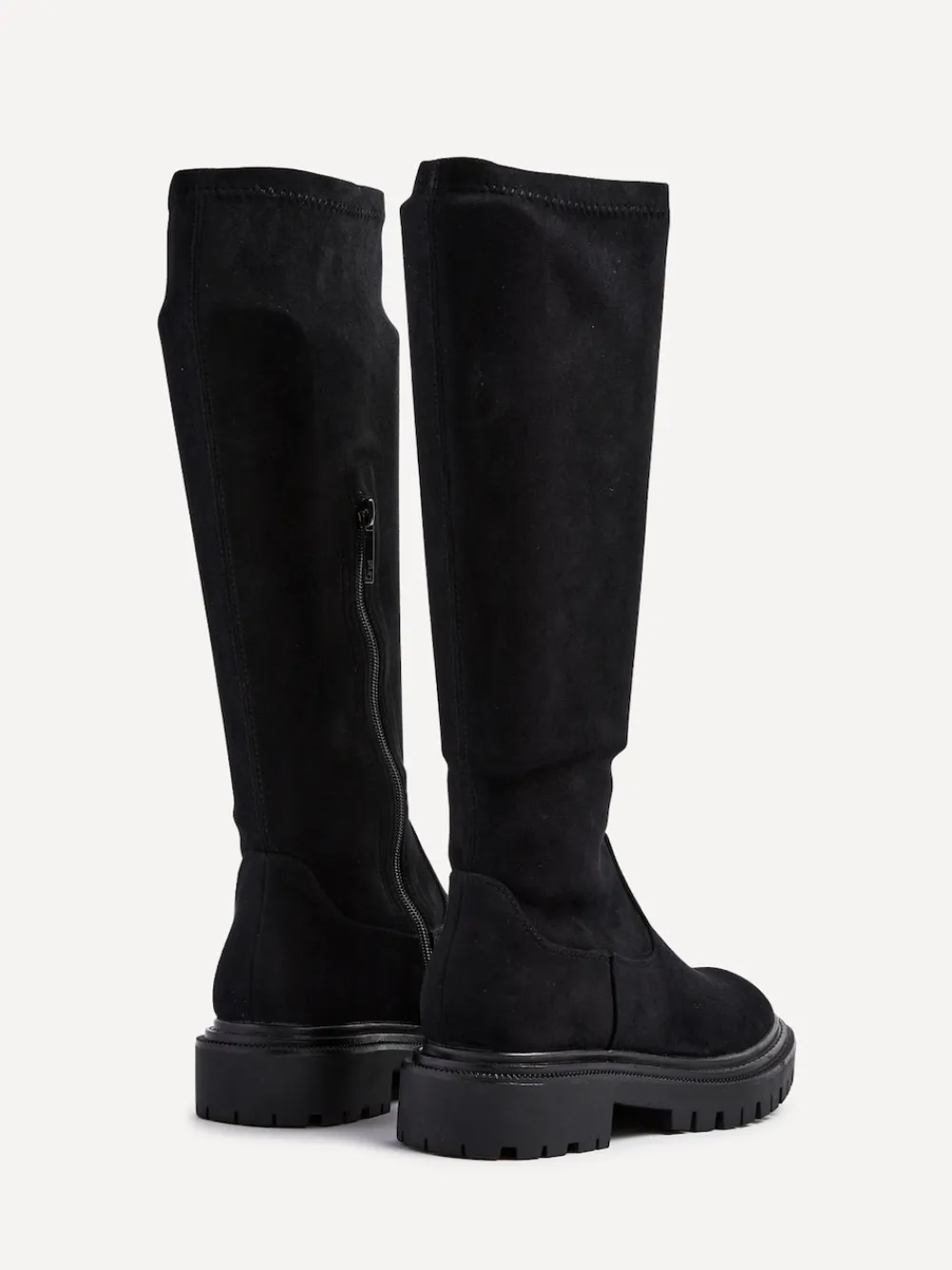 Our Best-Selling Hallie High Leg Boot is back. Its stretch faux suede seamlessly shapes your leg, ensuring a flawless fit every time. With a sturdy chunky sole and a cushioned padded in-sock, this boot offers unbeatable comfort for all-day wearability. Upper – Textile, Sole – Other Materials, Lining & Sock – Textile.