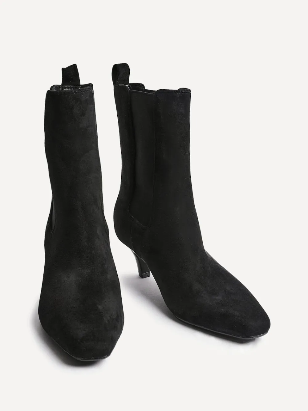 Step into the season with the Ritual Boot – your ultimate cold-weather essential. Featuring a sculpted toe shape, sleek elastic side panels, and a refined kitten heel, this silhouette brings effortless polish to everything from tailored denim to flowing midi skirts. Made with a with high quality faux suede and a soft, cushioned in-sock for added comfort.Boot length: 17cm Heel height 5.5cm. Upper – 100% Other fibres, Lining. and Sock – 100% Other fibres. Sole – 100% Rubber.