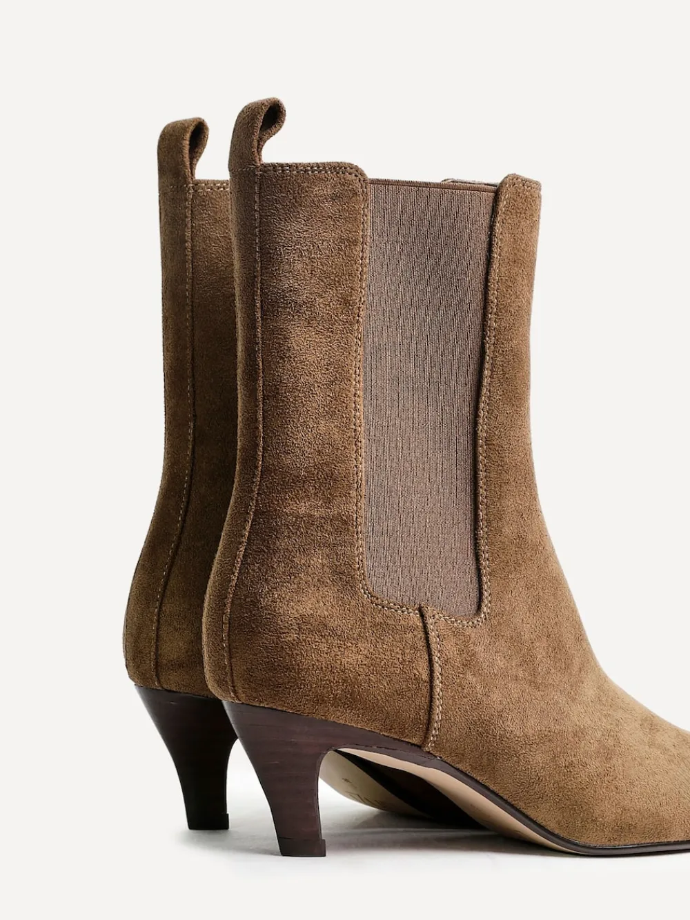 Step into the season with the Ritual Boot – your ultimate cold-weather essential. Featuring a sculpted toe shape, sleek elastic side panels, and a refined kitten heel, this silhouette brings effortless polish to everything from tailored denim to flowing midi skirts. Made with a with high quality faux suede and a soft, cushioned in-sock for added comfort.Boot length: 17cm Heel height 5.5cm. Upper – 100% Other fibres, Lining. and Sock – 100% Other fibres. Sole – 100% Rubber.