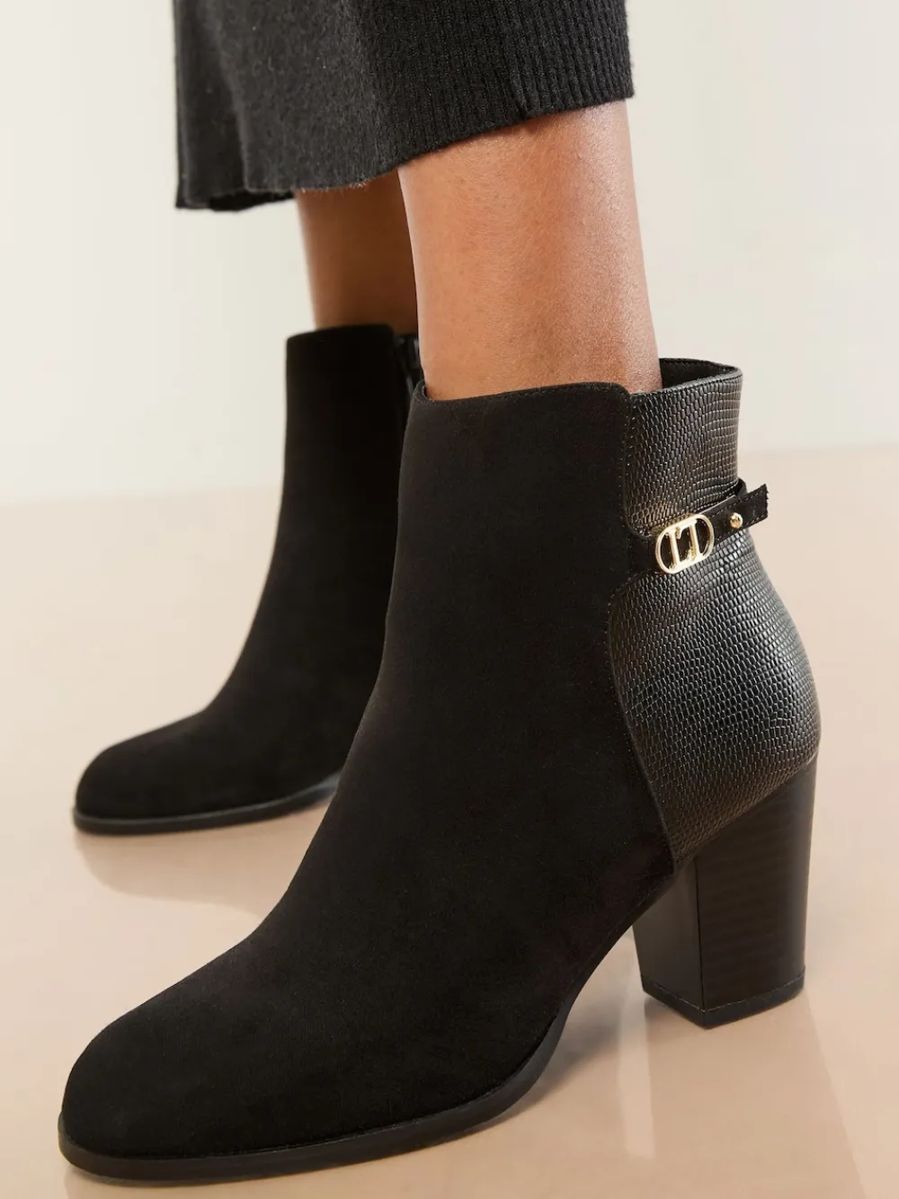 Designed with a flattering almond toe, they provide a classic and elegant silhouette. The comfortable mid-heel offers a practical lift for all-day wear, making them ideal for both work and weekend outings. Crafted in a sleek black faux suede, these boots feature a subtle yet stylish detail at the ankle. A panel with a delicate snakeskin-effect texture and a gold-toned buckle adds a touch of understated luxury and visual interest. The side zip closure ensures easy on and off. Features:- Classic almond toe silhouette Comfortable and wearable mid-heel Sleek black faux suede Snakeskin-effect panel and gold-toned buckle Convenient side zip closure Upper – Textile, Other Materials, Lining & Sock – Other Materials, Textile, Sole – Other Materials.