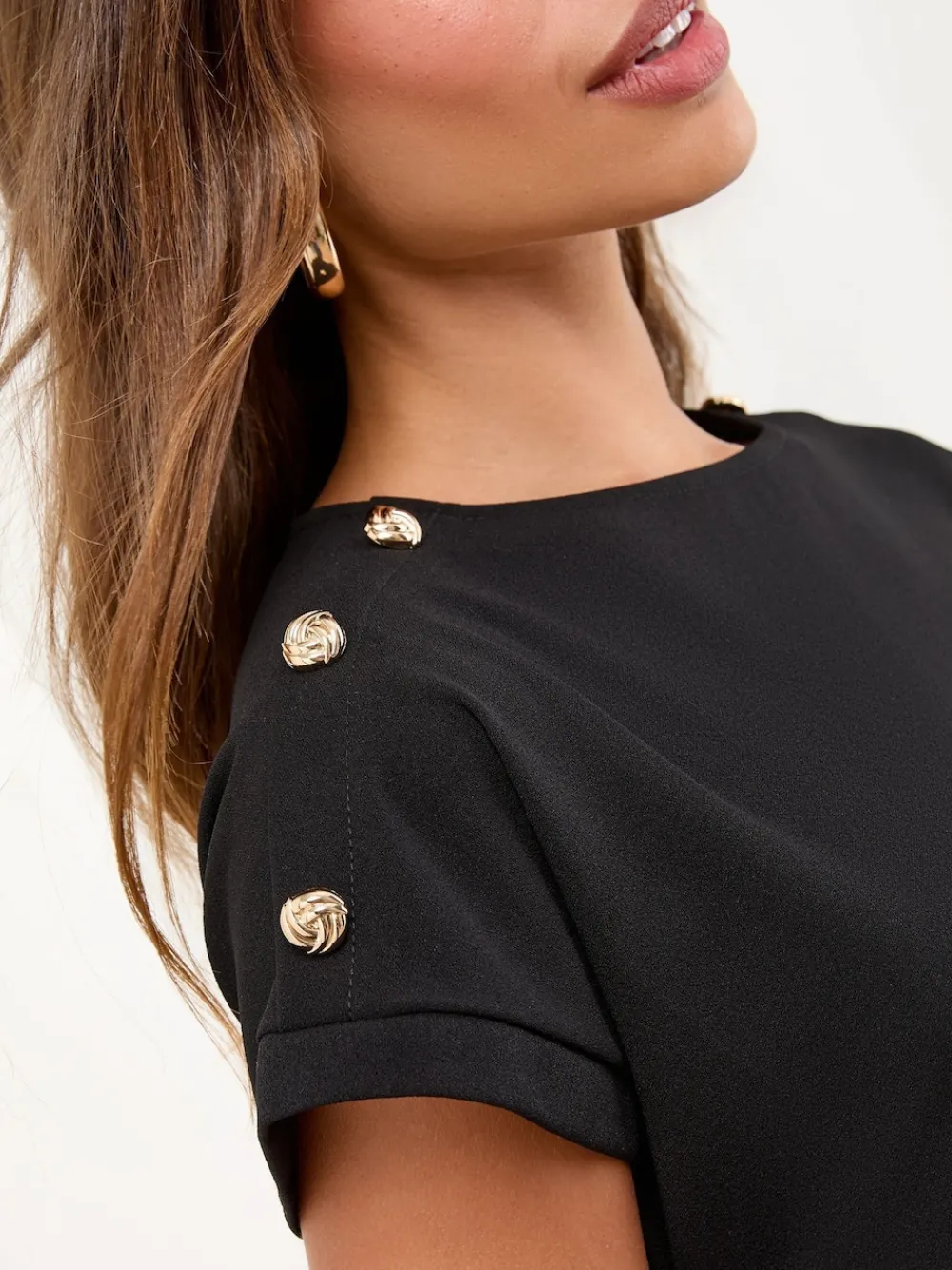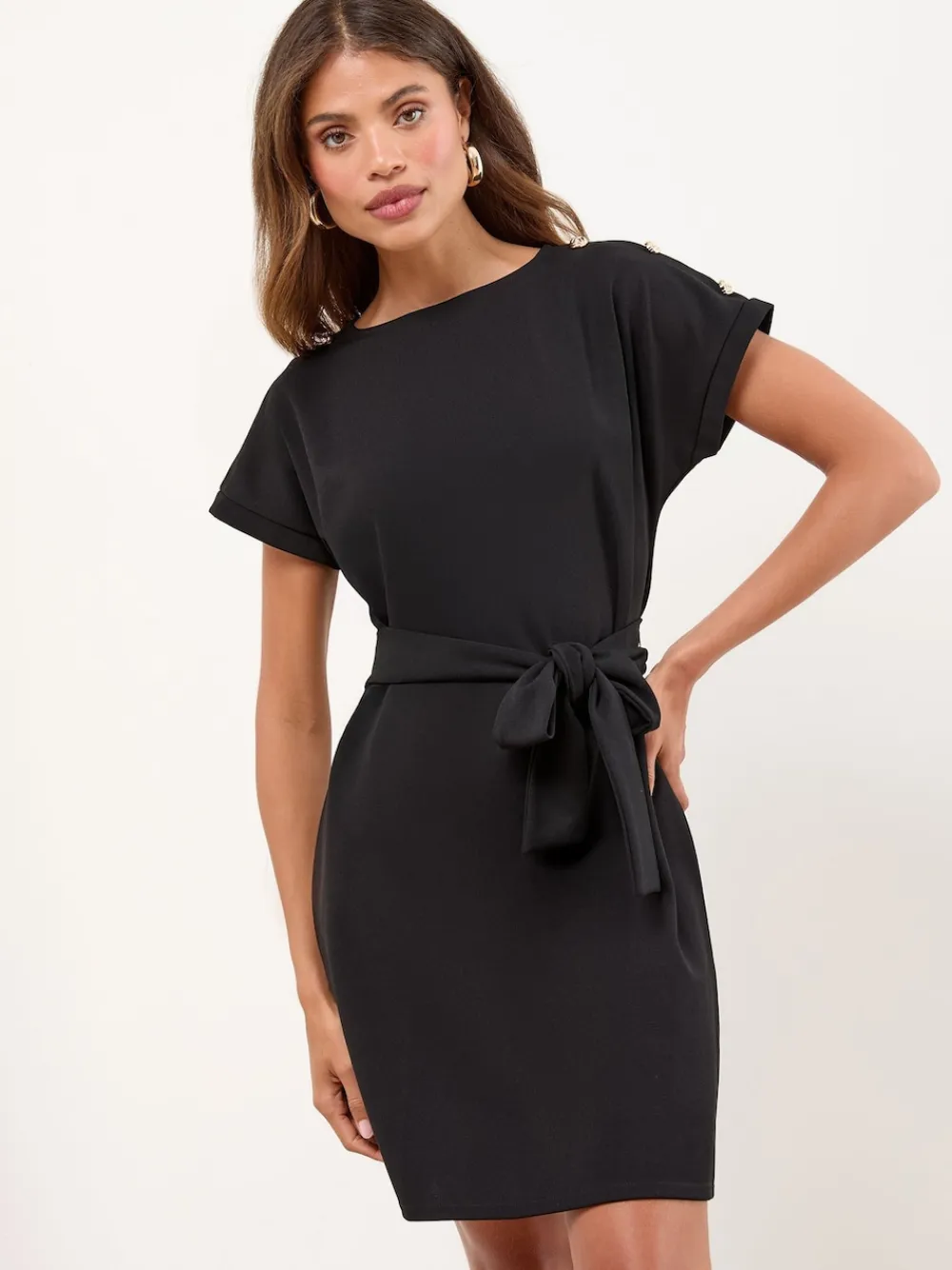 This sophisticated mini shift dress is your perfect option for transitioning seamlessly from desk to dinner. The simple, elegant cut is elevated by chic military button detailing at the shoulder and a flattering tie belt to cinch the waist. Ideal for smart workwear or chic special occasions. Military button detail on shoulder Tie belt fastening Short sleeves Mini shift dress style Main 97% Polyester, 3% Elastane. Lining 100% Polyester.