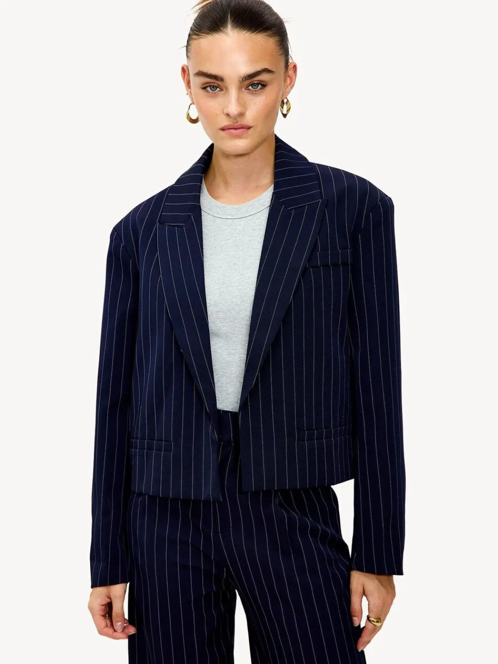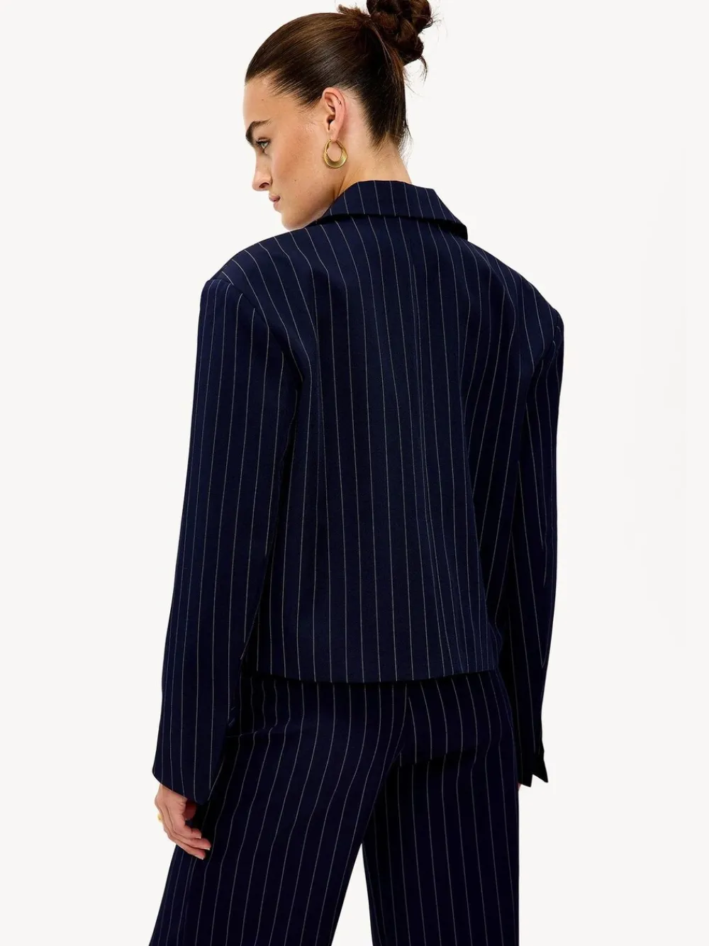 This dark blue blazer features a classic pinstripe pattern for a power dressing look. The tailored fit with a cinched waist and statement lapels creates a professional appearance. The button closure and shoulder padding give this blazer a strong shape. Style this blazer with the matching wide-leg trousers for a complete suit look during office days. 95% Polyester, 5% Elastane.