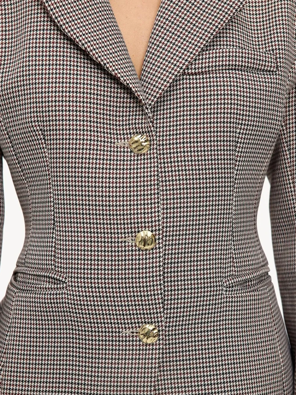 This tailored blazer features a classic houndstooth pattern in neutral tones for a timeless look. The tailored fit with gold statement buttons and sharp lapels creates a chic professional appearance. The long blazer with subtle split detail gives a modern twist to the classic design. Style this blazer with the matching shorts for a sophisticated co-ord look. 97% Polyester, 3% Elastane.