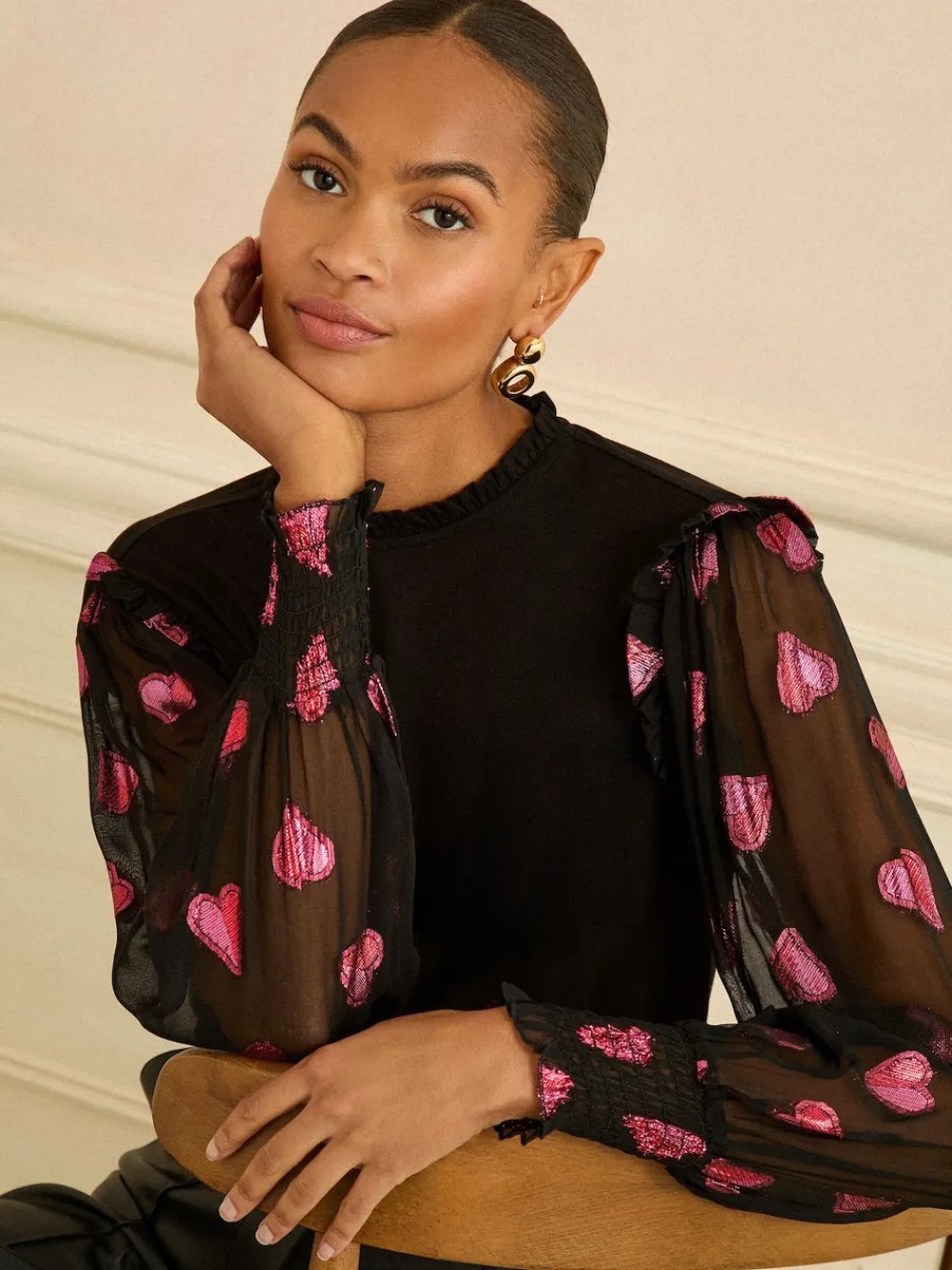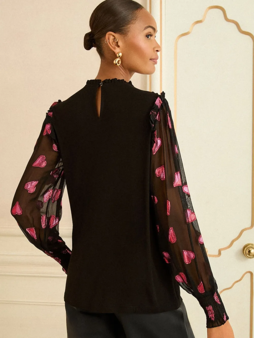 Turn heads in this stylish Love & Roses top. The mixed jersey body ensures comfort, while the contrasting sheer sleeves feature a playful black and red heart print. Ruffle detailing at the shoulder and cuff adds a feminine touch, perfect for a chic evening look. Sheer sleeves Black and red heart print Mixed jersey body Ruffle detail on shoulder and cuff Main 100% Viscose. Sleeves 93% Viscose, 7% Metallised fibre.
