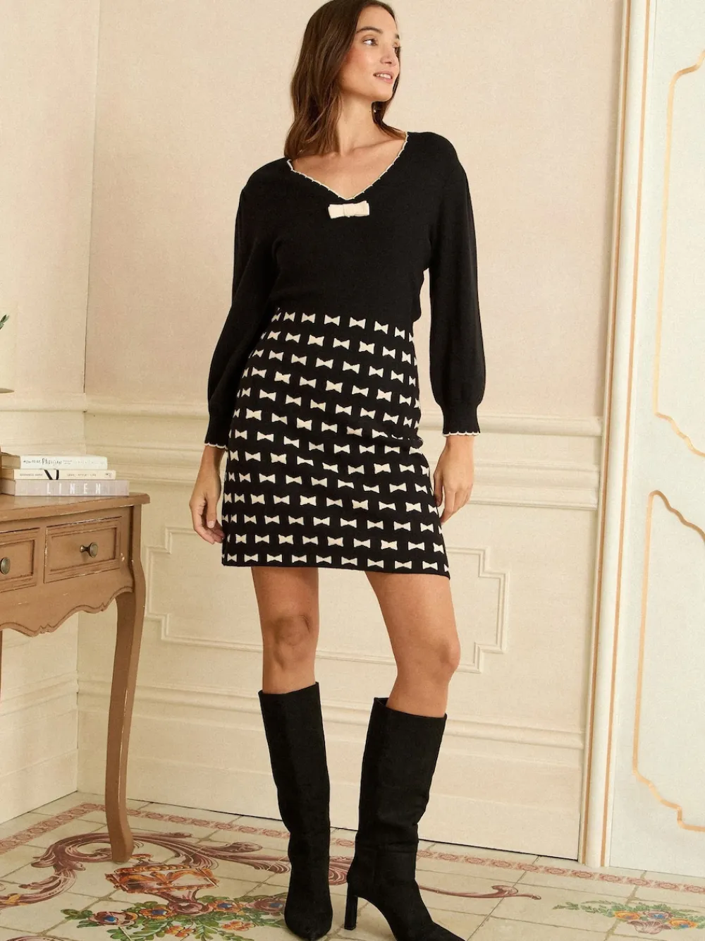 Love & Roses Black Bow Print V-Neck Knitted Mini Dress Hot