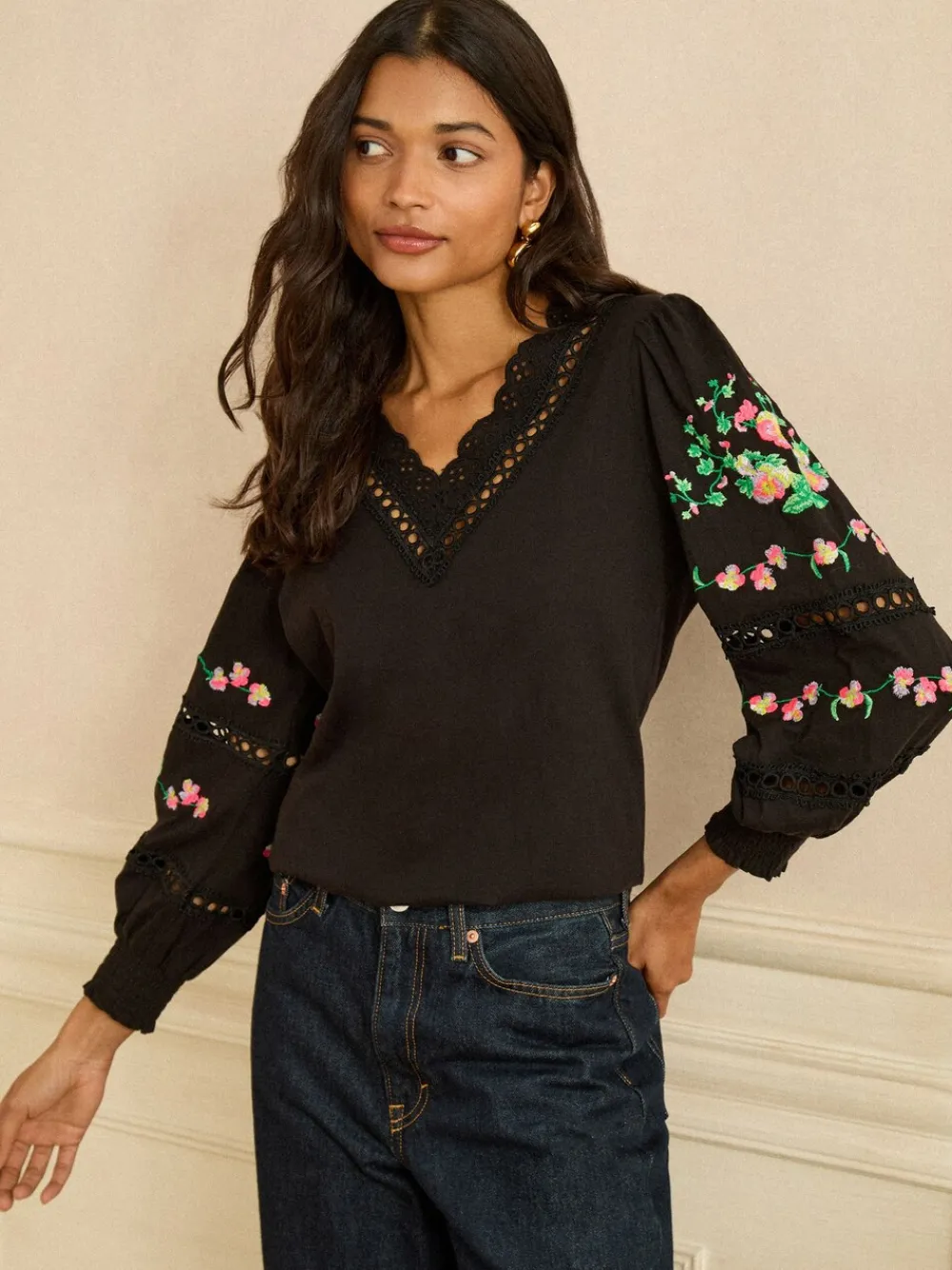 Love & Roses Black Floral Embrodiery Lace Insert Petite V-Neck Long Sleeve Top Hot