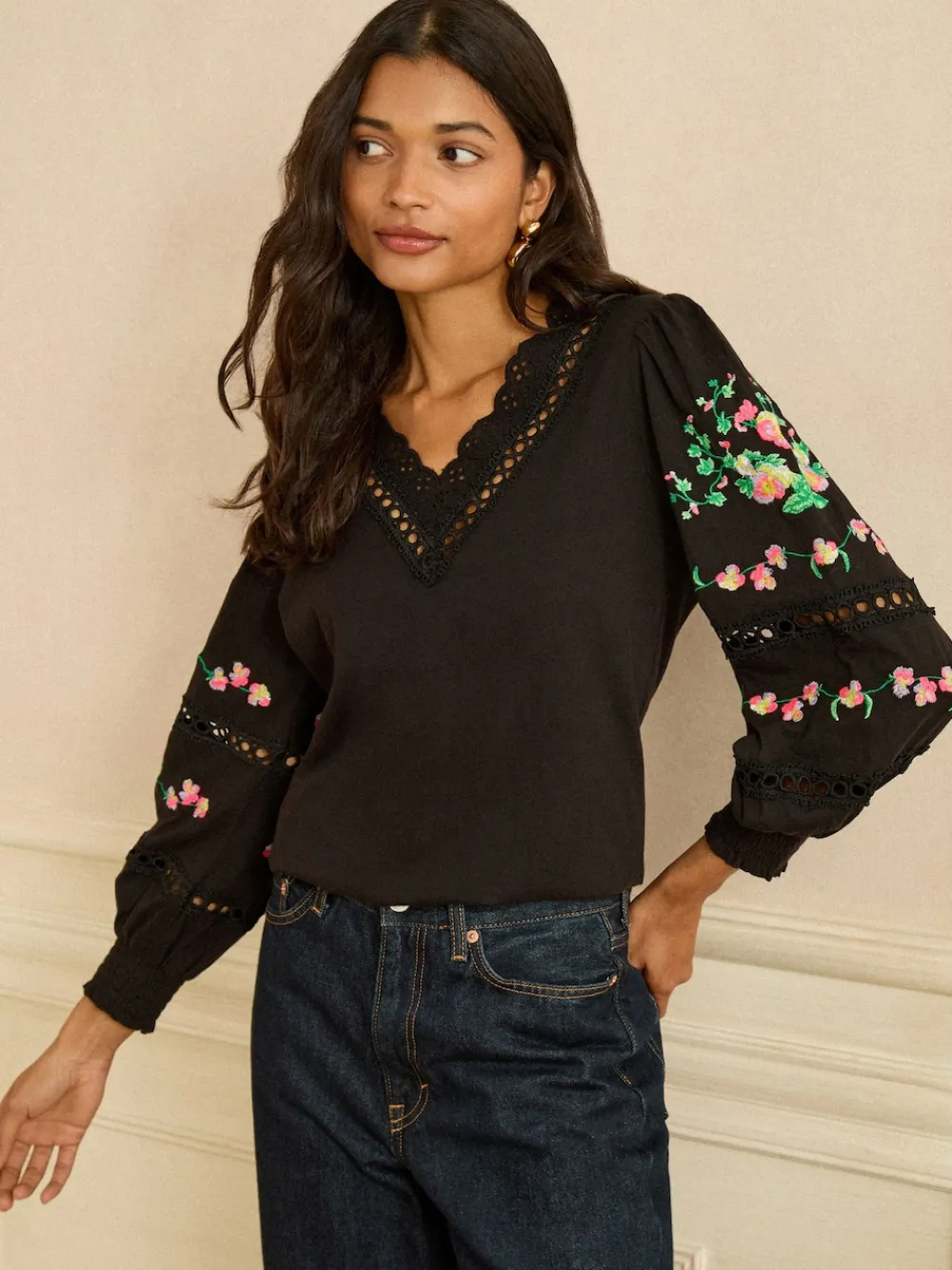 Love & Roses Black Floral Embrodiery Lace Insert V-Neck Long Sleeve Top Clearance
