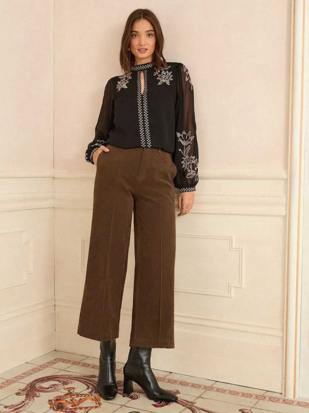 Love & Roses Black Gold Embroidery Long Sleeve High Neck Blouse Discount