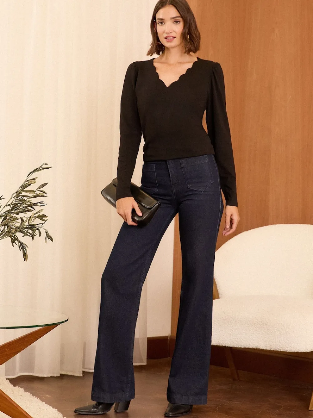 Love & Roses Black Scallop V-Neck Long Sleeve Jersey Top Best