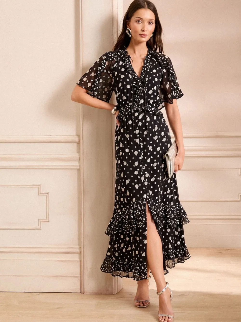 Love & Roses Black Spot Ruffle Maxi Dress Sale