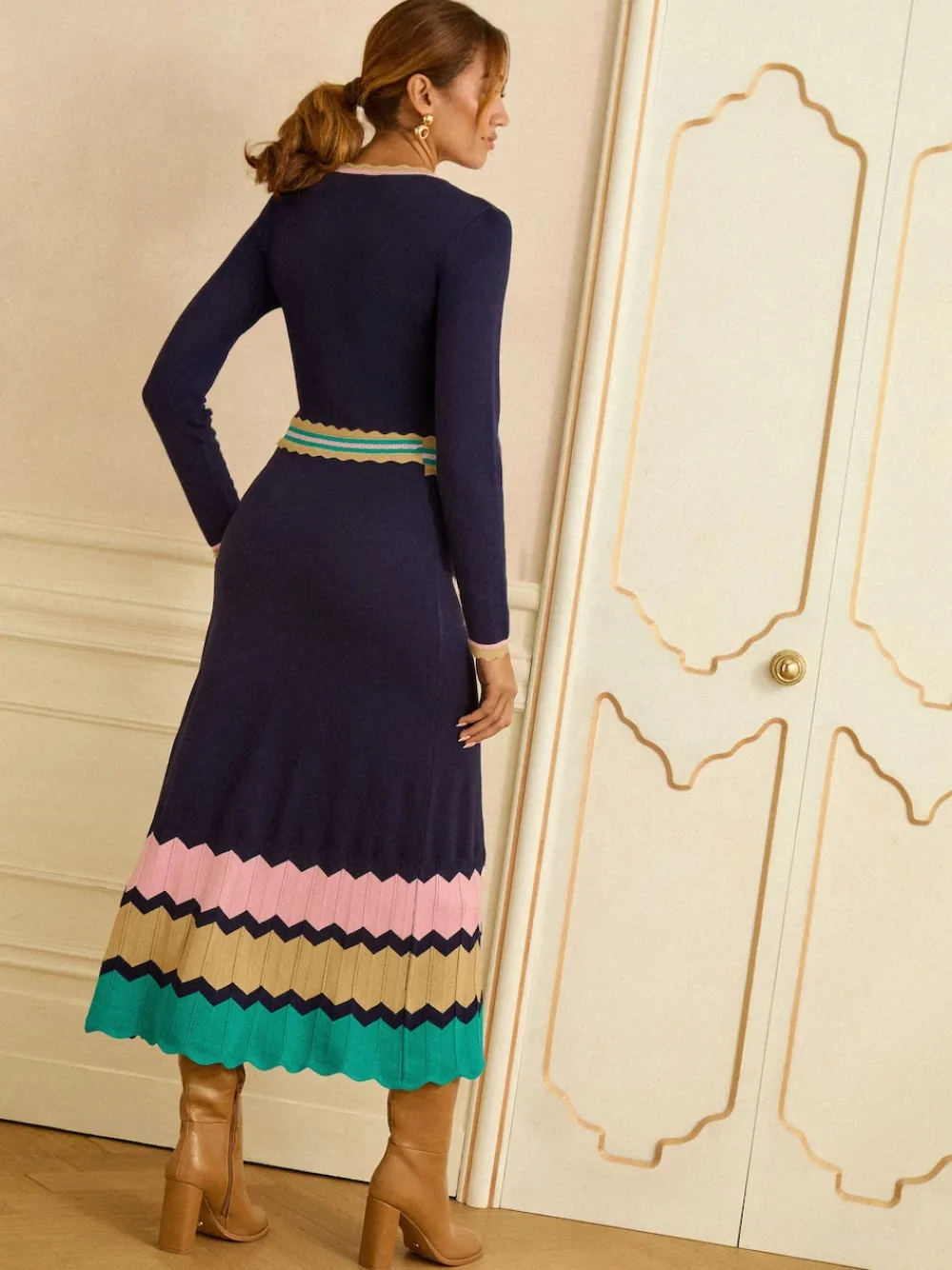 Embrace sophisticated knitwear with this purple long-sleeve midi dress. Featuring a flattering notch neck and striking multi-coloured chevron patterns at the waist and hem, this dress is stylish and cosy. Perfect for adding a vibrant, fashionable touch to your cold-weather wardrobe. Chevron pattern detailing Notch neck Long sleeves Knitted midi dress 69% Viscose, 31% Nylon.