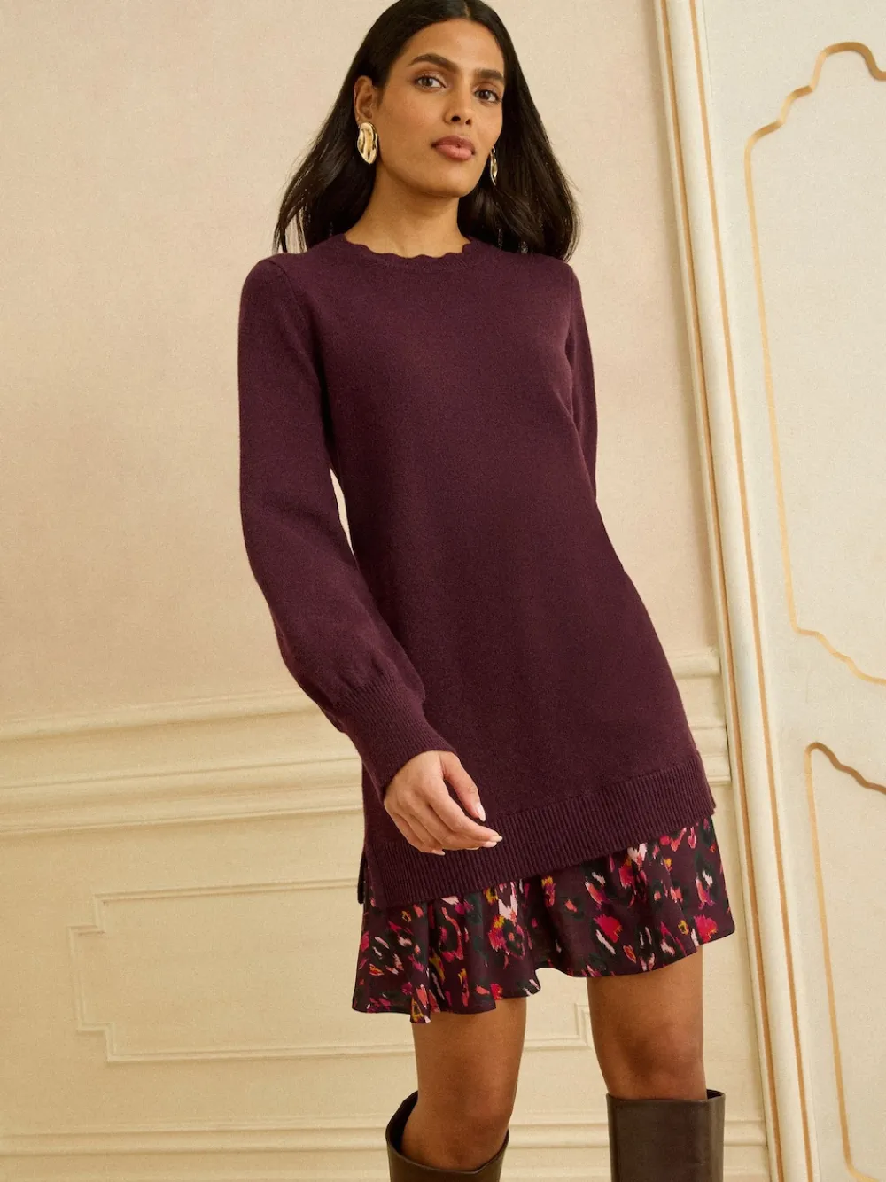 This cosy Knit Dress is perfect for sophisticated autumn styling. The soft knit dress features an elegant scallop neckline and long sleeves for warmth, beautifully contrasted by a voluminous woven skirt hem with a delicate floral print. This charming mini dress is ideal for day-to-night wear and feeling instantly feminine. Knit dress body Woven print skirt hem Scallop neckline Long sleeve Main 51% Acrylic, 30% Polyester, 19% Nylon. Trim 100% Polyester.