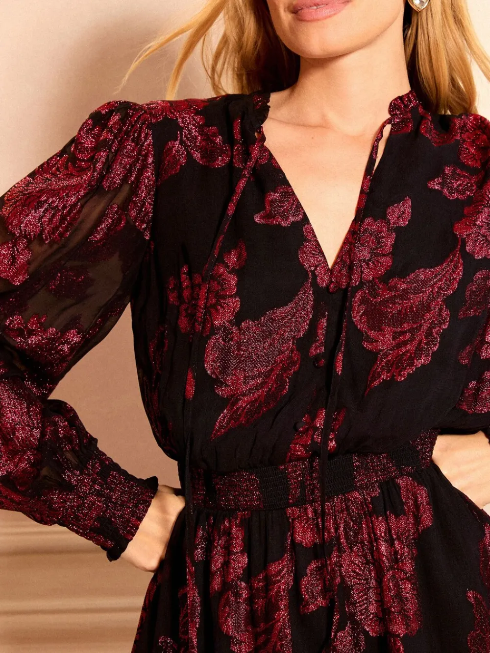 Make a sophisticated statement on your next night out with the Love & Roses Red Tie Neck Mini Dress. This stunning mini dress features a black sheer fabric beautifully adorned with a rich red metallic floral burnout pattern that shimmers as you move. The elegant V-neckline is complemented by a delicate tie-neck detail and long, voluminous sleeves that gather at the cuffs. With a defined, elasticated waist and a flirty skater skirt, this dress creates a flattering silhouette perfect for any going out occasion. Tie neck Long sleeve Red metallic detailing Skater skirt Main 83% Viscose, 17% Metallised fibre. Lining 100% Polyester.