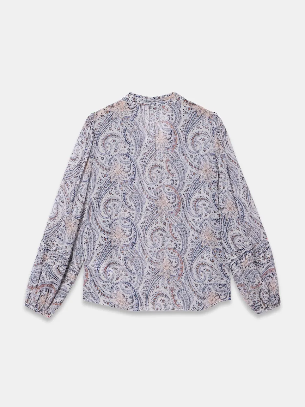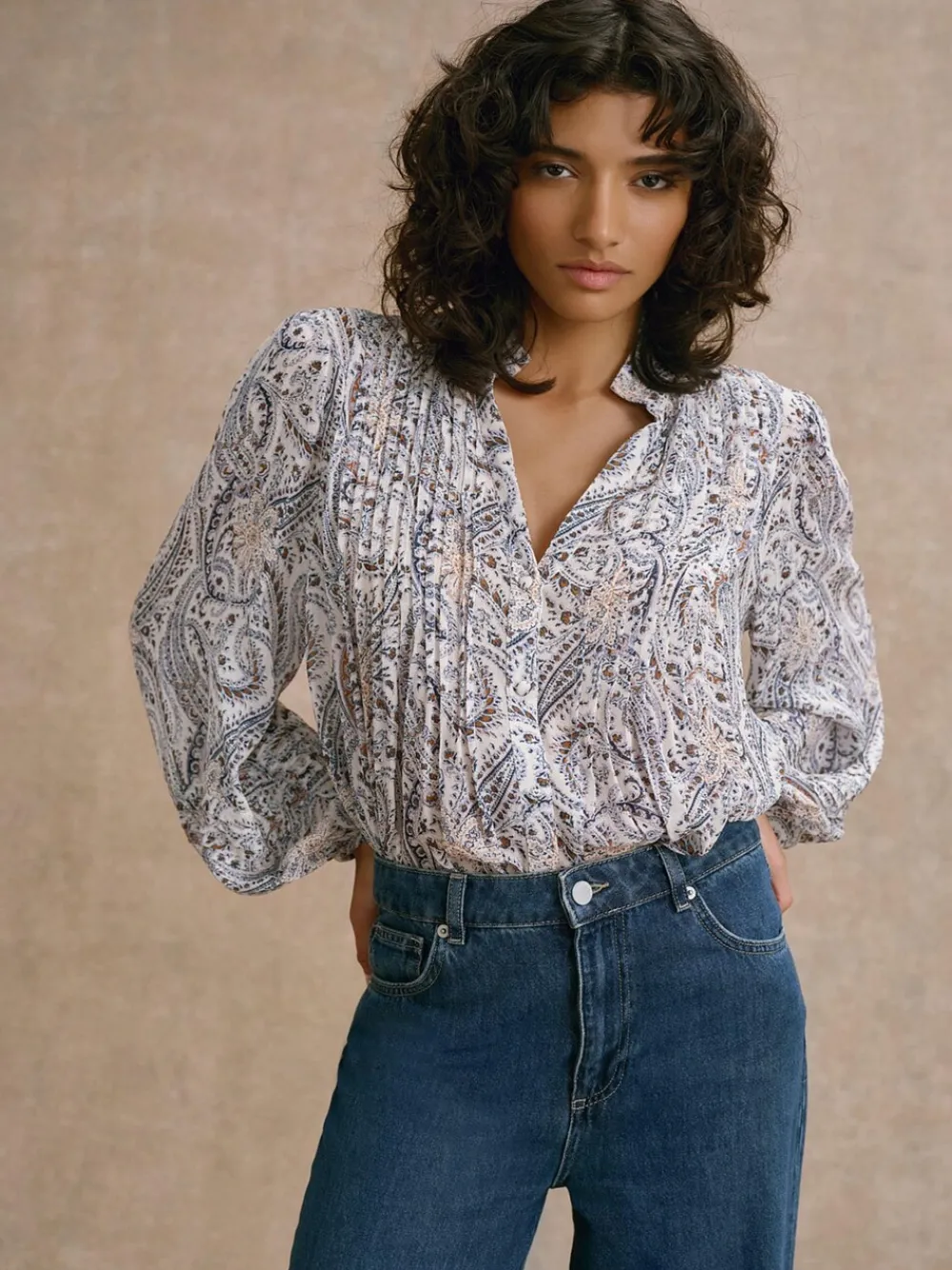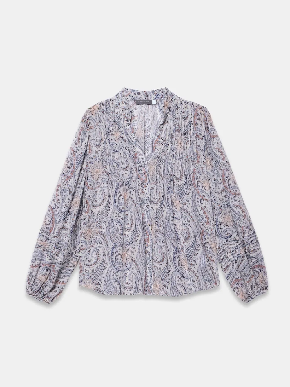 Neutral tone paisley print blouse featuring a V-neckline, pin tuck detailing, long sleeves, buttoned cuffs with a button fastening through the front. Machine washable. 100% Viscose.