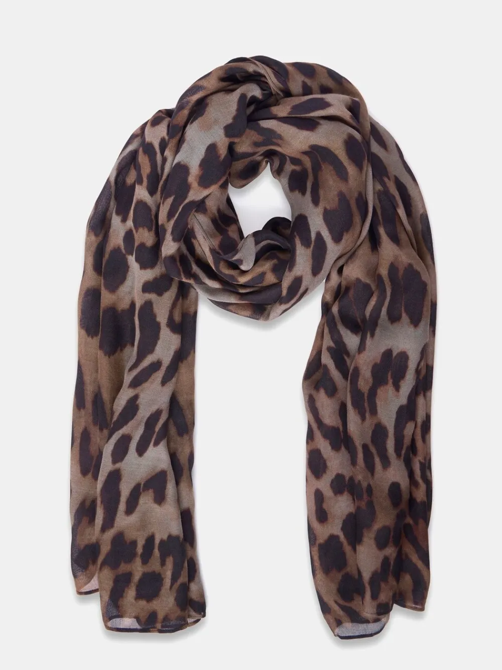 Neutral leopard print scarf in a rectangular shape. Scarf measures 180cm/ 71in length and 100cm/39.5in in width. Hand wash only. 100% Viscose.