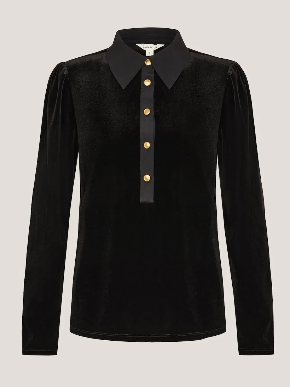 Shirts, elevated. No A/W wardrobe is complete without a bit of velvet to choose from. Designed with a sharp collar and gold button placket, this top is a versatile option to dress down with jeans or tuck into statement flares. Machine washable. 95% Polyester, 5% Elastane.