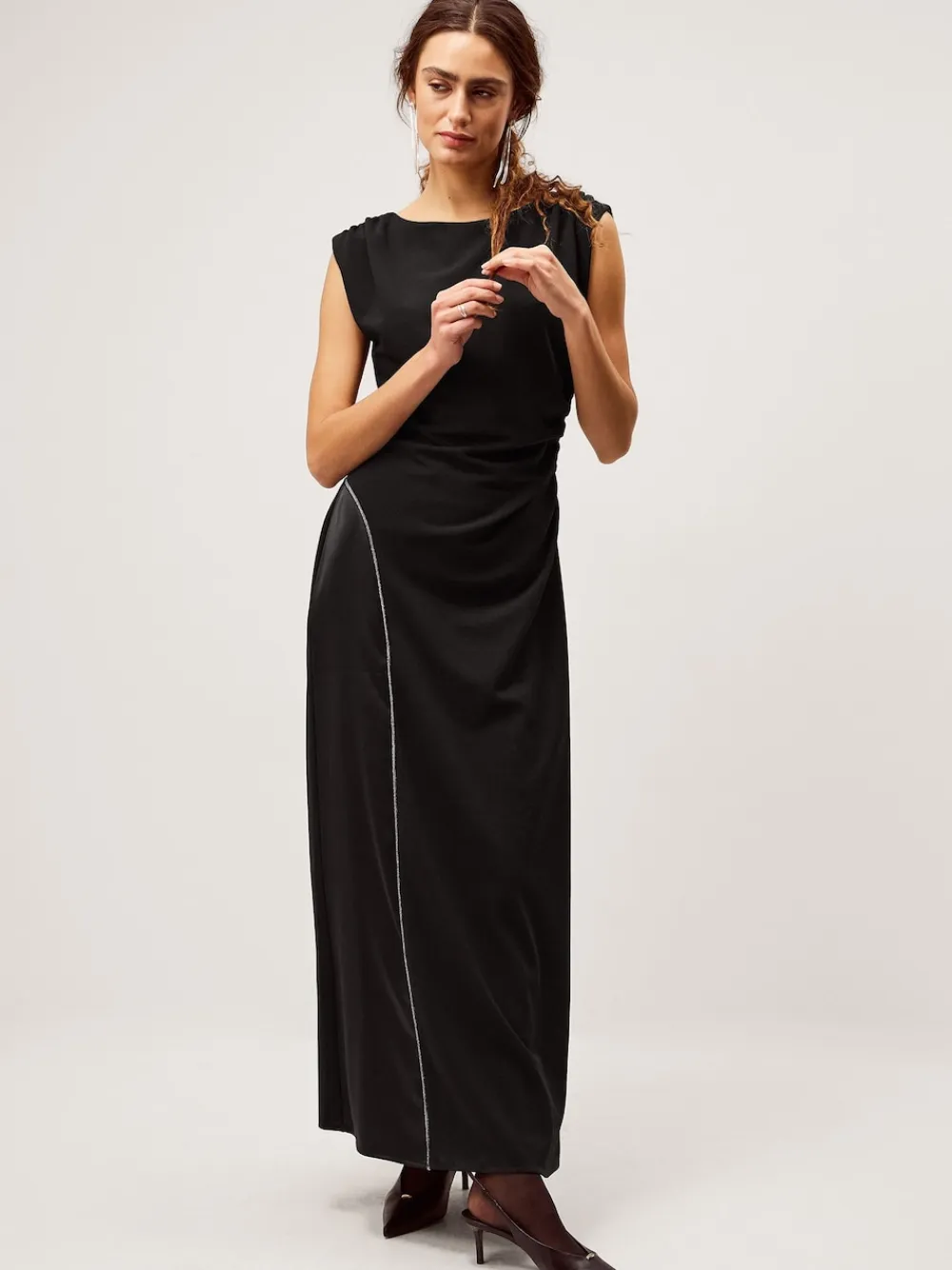 Silhouette of the season. Designed with a sparkle trim satin strip that starts at the hip, this maxi dress features an elegant boat neckline and ruched detailing at the waist. Best styled with glittery jewels and kitten heels, all that’s missing is the invitation. Machine washable. 97% Polyester, 3% Elastane.