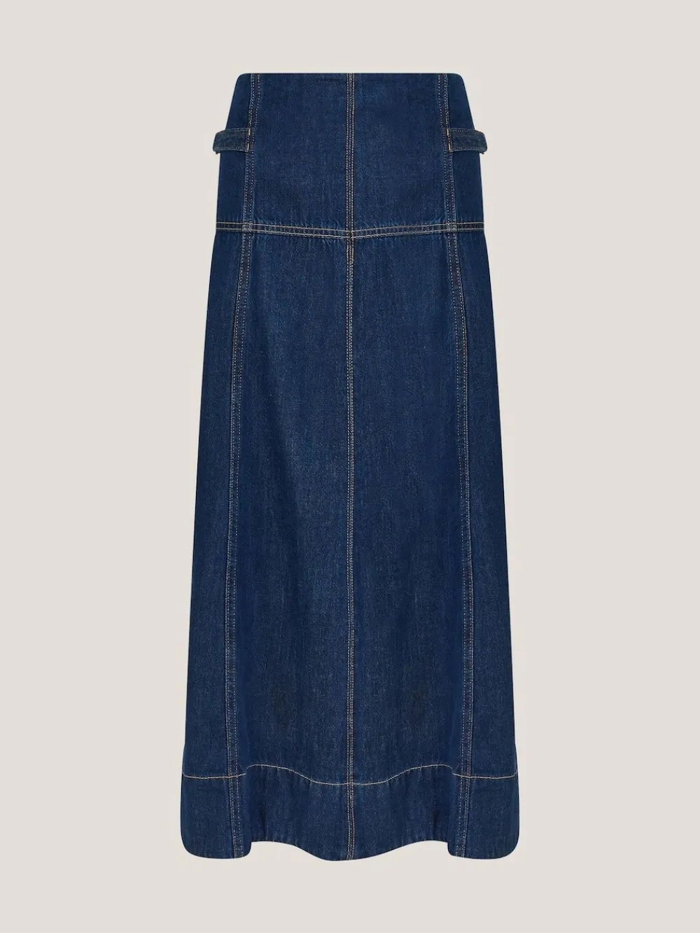 No regrets. Falling to midi length, this denim skirt flares into an A-line cut with tobacco stitching. Style it through summer with a cami and sandals, and autumn with knee high boots and a blouse. Finished with gold-tone equestrian buckles to sides. Machine washable. 67% Cotton, 33% TENCEL™ lyocell.