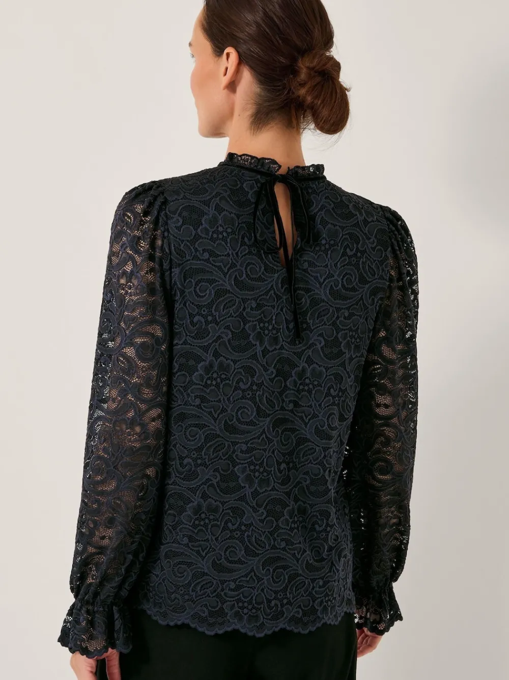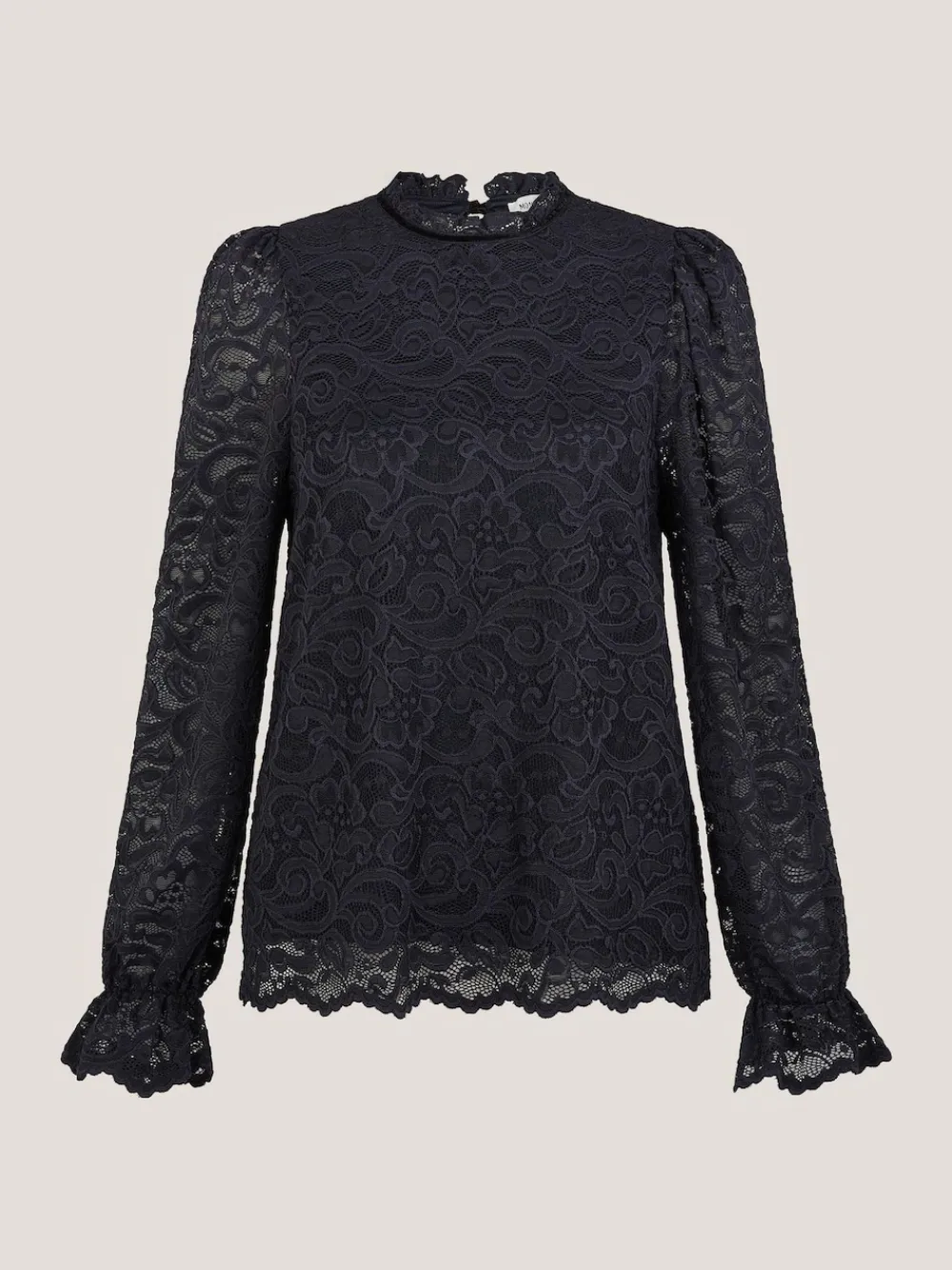 Lovely in lace. Built with intricate embroidery that boasts floral detailing, this lace top is complemented by a frilly neckline and long, frilly sleeves. Finished with a tie fastening to the back. Machine washable. 95% Nylon, 5% Elastane.