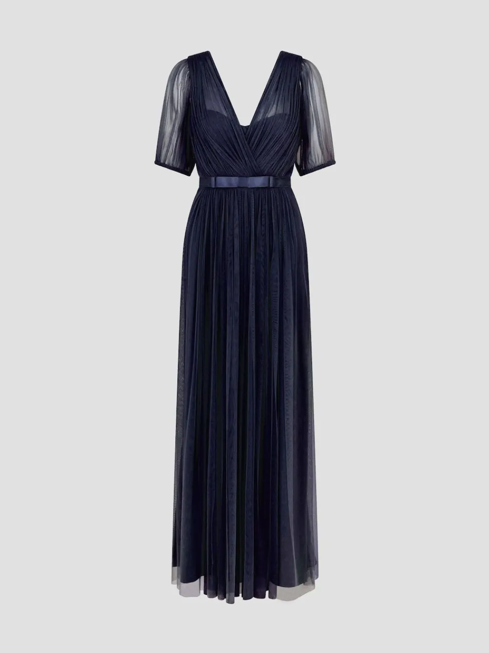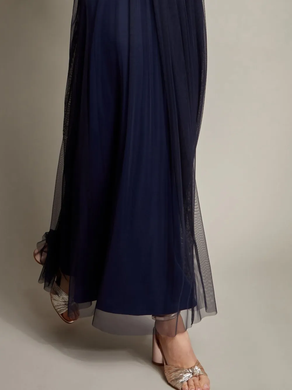 Monsoon Ellie Sheer Sleeve Plunge Tulle Maxi Dress Blue Clearance
