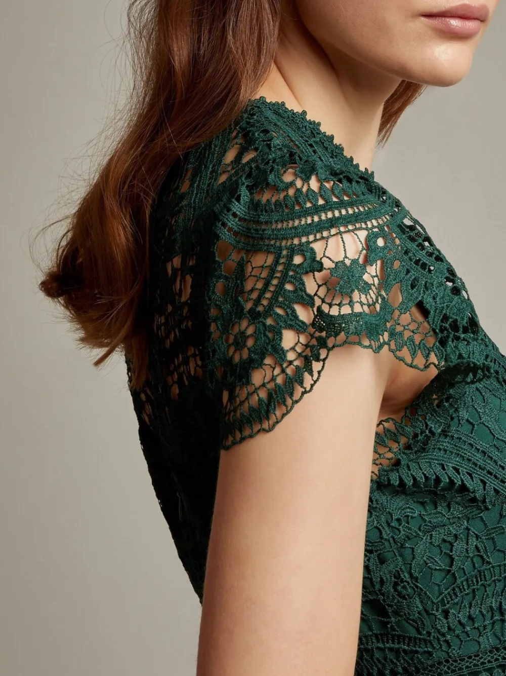 The things you can do with a little bit of lace. The dress that floats down the aisle – and into the reception- finds intricate, floral lace that spills over the décolletage and flutter sleeves. We’ve lined the dress from the sweetheart neckline down, with a defined waist and maxi-length hem that swishes just the right amount. Fastens with a keyhole button and discreet zip. Dry clean only. 100% Polyester.