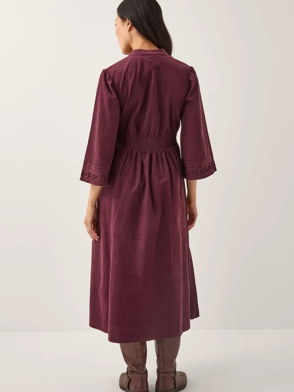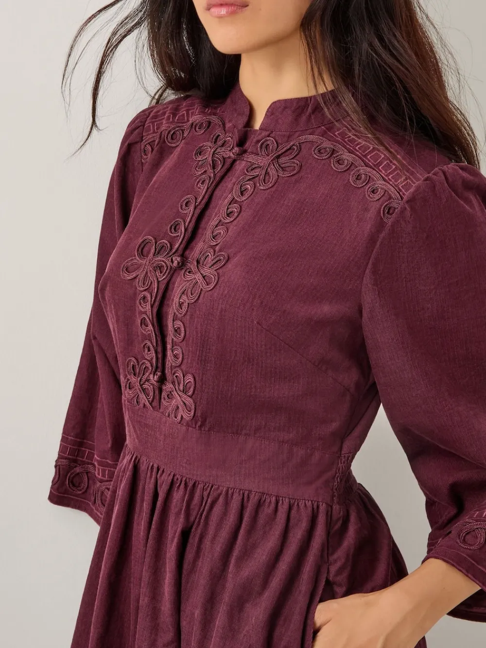 Cherry cute. Something a little different for your dress collection. Designed with soft corduroy in a rich cherry shade, it s stitched with bold loop and floral embroidery at the sleeves and bodice with Chinese knot buttons through the front. And the best thing? It has side pockets. Machine washable. 100% Cotton.