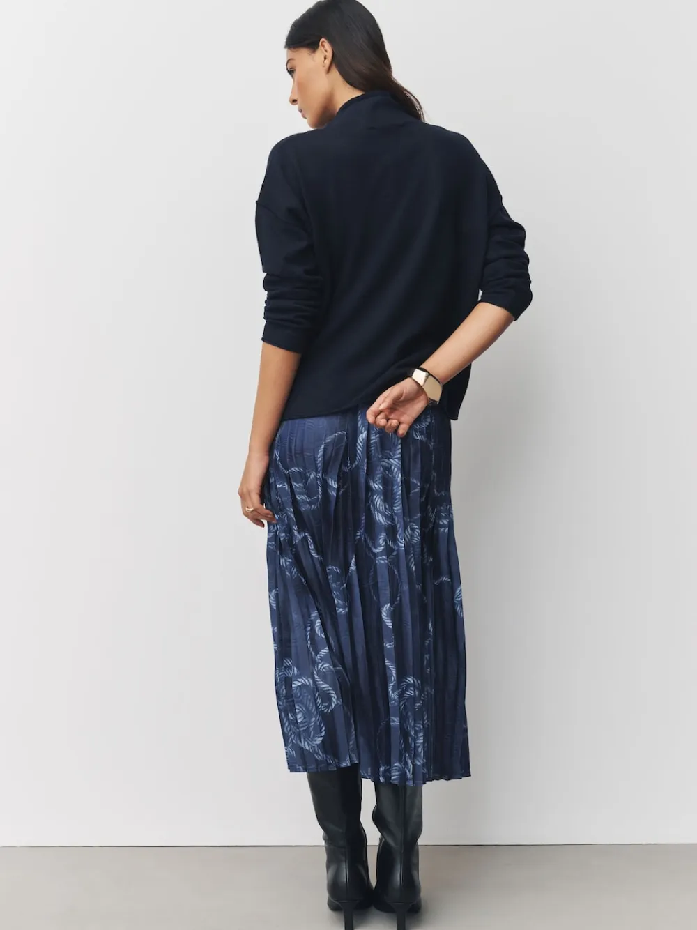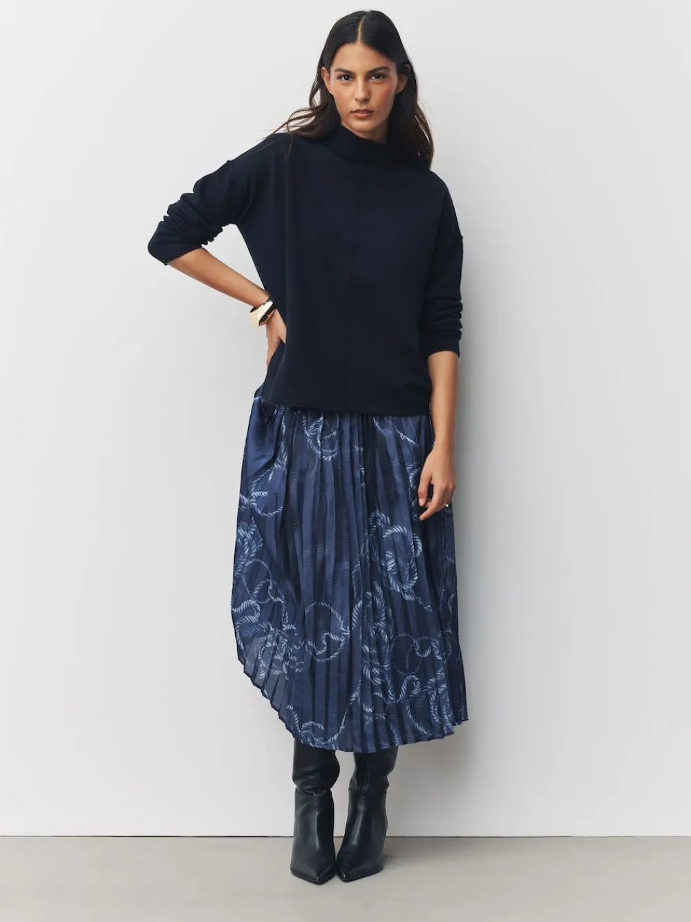 Next 2-In-1 Knitted Jumper with Pleated Midi Skirt Navy Blue Nautical Print