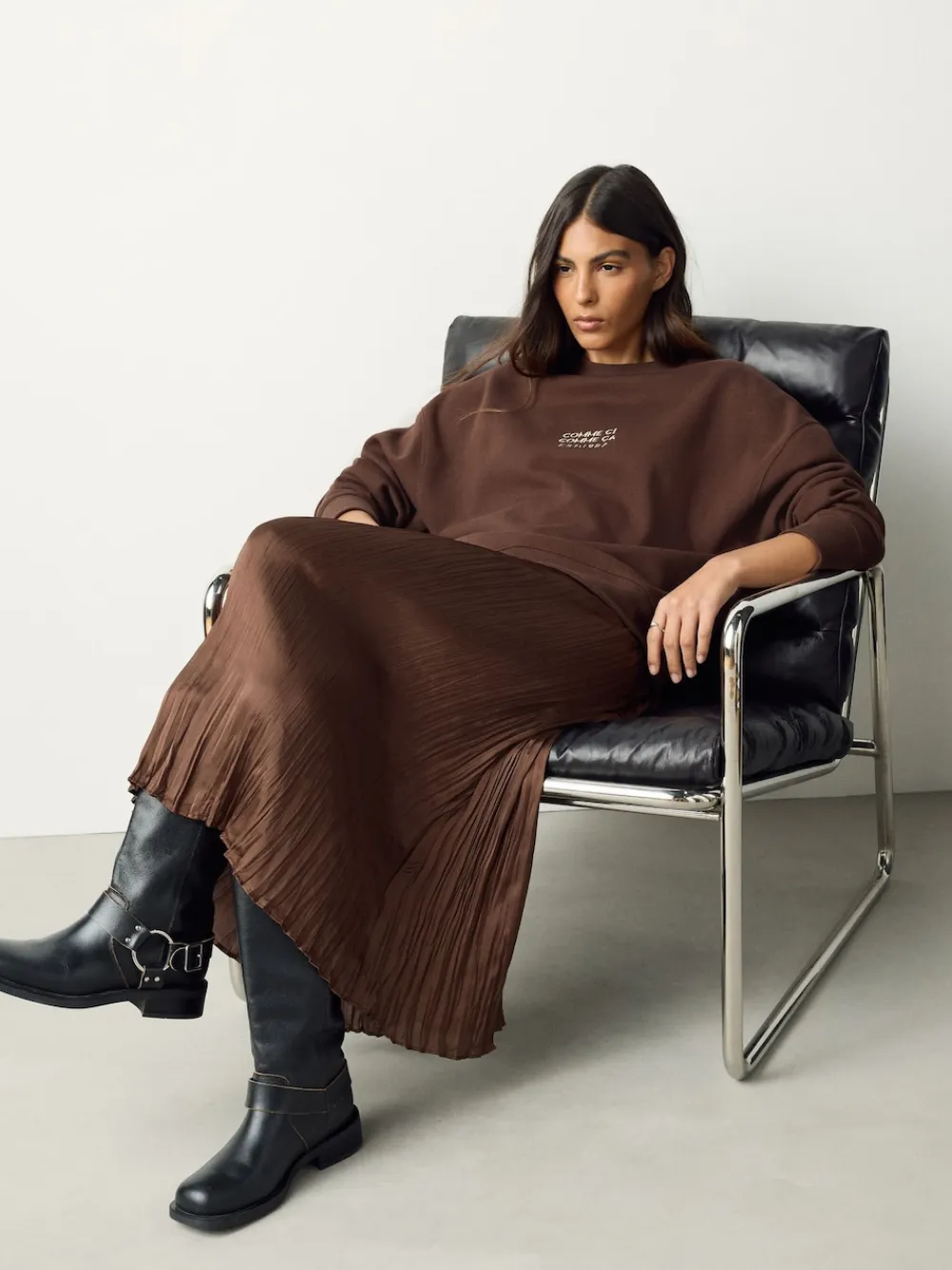 Elevate your wardrobe this Autumn with this chocolate brown 2-in-1 Jumper with Satin Midi Skirt. This stylish piece features a cosy jumper top and a flowing satin midi skirt, designed for comfort and sophistication. Ideal for transitional weather, this ensemble combines warmth with a touch of luxury. 2-in-1 design Cosy jumper top Flowing satin midi skirt Embroidered slogan Machine washable. Main 70% Cotton, 30% Recycled polyester. Rib 97% Cotton, 3% Elastane. Skirt 100% Recycled polyester. Our tall collection is designed to fit women 5’10” and above. This has been proportionally increased through the body, leg and sleeve to achieve the perfect fit. Available in sizes 8-20.