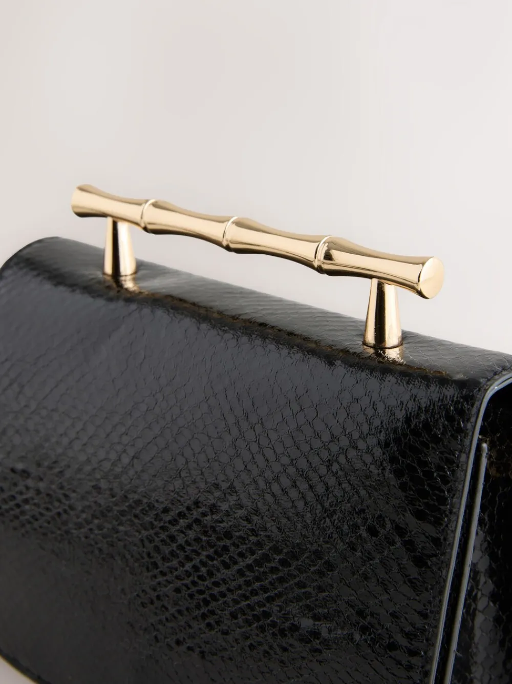 Elevate your evening wear with this striking top handle bag. Featuring a high-shine black finish and an elegant gold-tone bamboo-style handle, it exudes luxury. The compact, structured shape is secured by a magnetic close and includes an adjustable strap for versatile cross-body or shoulder styling. Gold-tone hardware handle Adjustable strap Magnetic close fastening Height 12cm Width 17cm Depth 7cm Outer 100% Polyurethane. Lining 100% Recycled polyester.