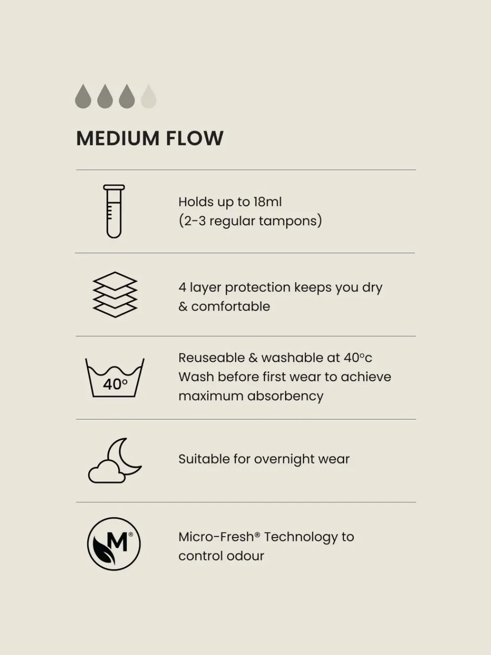 Medium Flow can be used on its own or as part of your usual routine on heavier days. High leg fit Holds up to 18 ml/approx 2-3 regular tampons Four-layer protection keeps you dry and comfortable Simply wash and wear Wash before wearing for the first time to achieve maximum absorbency, do not use fabric softener and hang to dry Supersoft comfortable fabric Elasticated waist Please Note: This product contains the biocide silver chloride (redefined from reaction mass of titanium dioxide and silver chloride) Machine washable. Main 95% Cotton, 5% Elastane. Gusset 65% Polyester, 35% Cotton. Items with the curve logo are available in sizes 18 and above.
