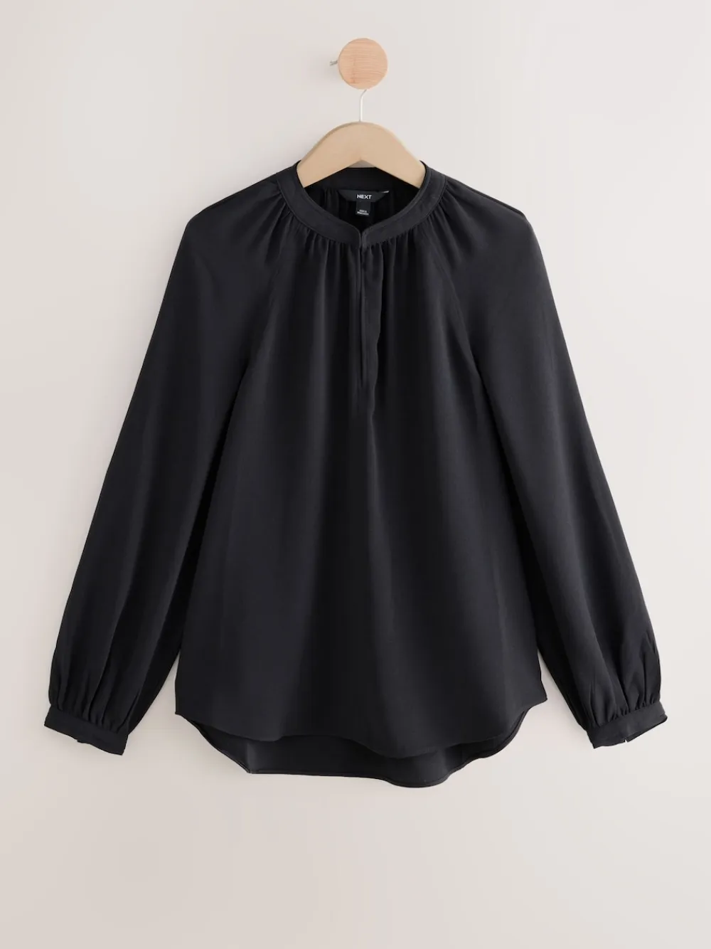 A perfect transitional piece from day to evening, this long-sleeve blouse in black is a great way to elevate your everyday look. It’s ideal as a workwear staple to style with dark denim and heels, and also features a buttoned grandad collar in a comfortable relaxed fit. The hook and eye fastening can be worn as a V-neck or as a keyhole style. Relaxed fit Workwear staple Grandad collar with V-split neckline V-neck or keyhole style Long sleeve Machine washable. 100% Recycled polyester. Items with the curve logo are available in sizes 18 and above.