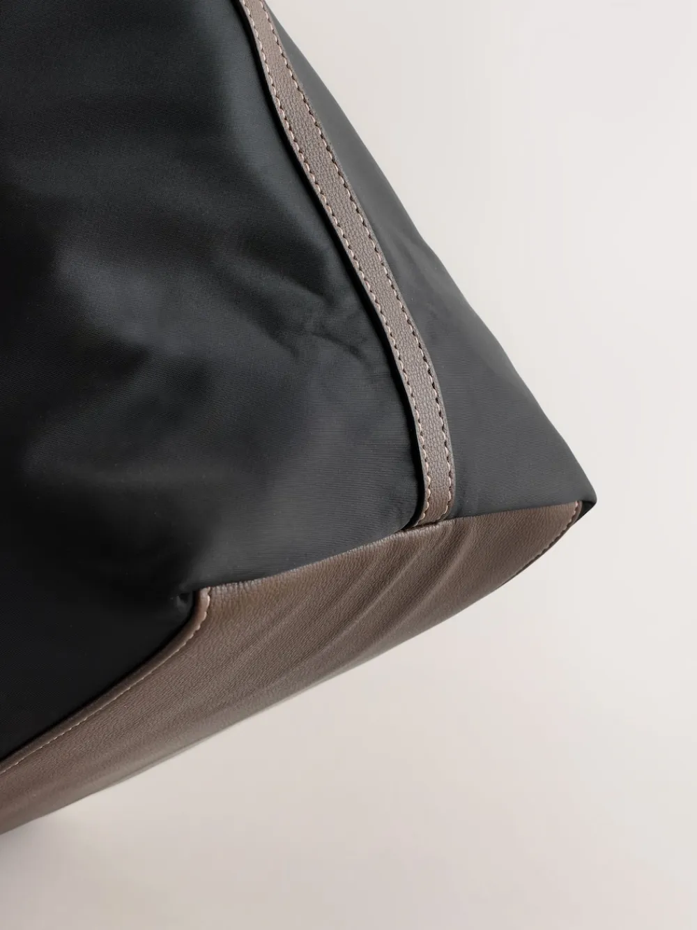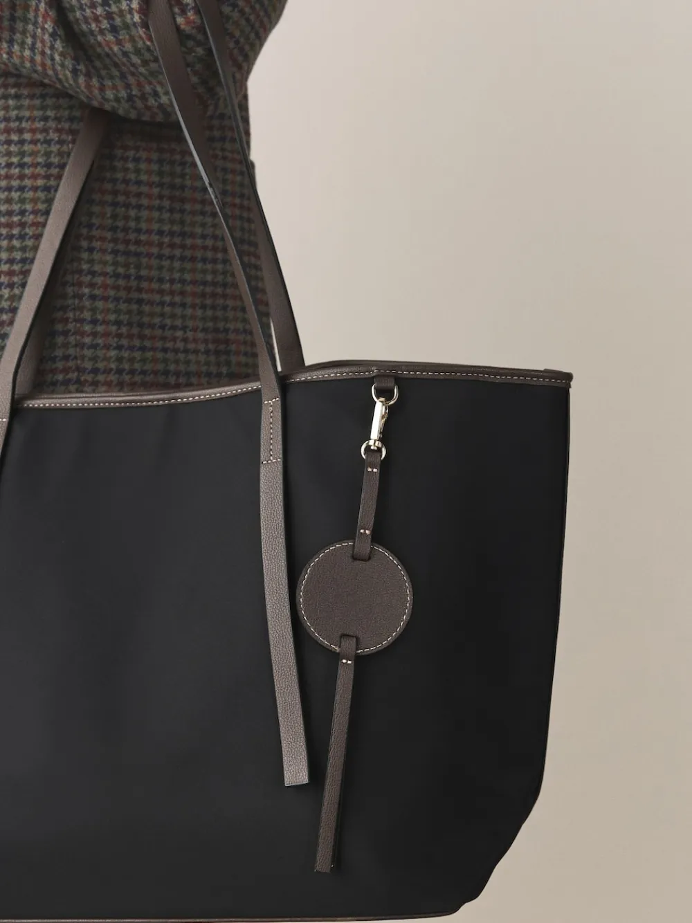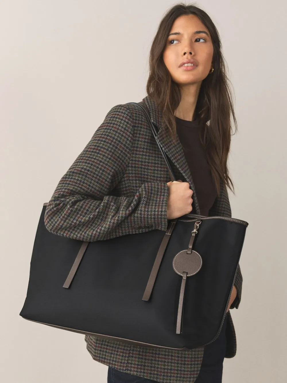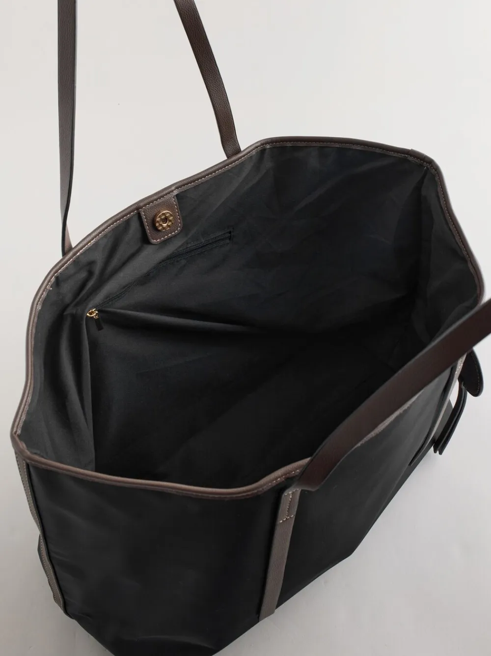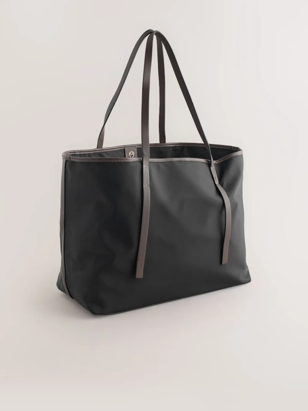 This practical black nylon shoulder bag is an ideal everyday companion. Crafted from durable nylon material, its classic tote design offers ample space for all your essentials. Complete with comfortable shoulder straps and a secure inside zip pocket, it’s perfect for effortless casual and work wear. Shoulder strap handles Inside zip pocket Zip fastening Tote bag style Height 32cm Width 53cm Depth 17.5cm Main 100% Nylon. Lining 100% Recycled polyester. Trim 100% PU.