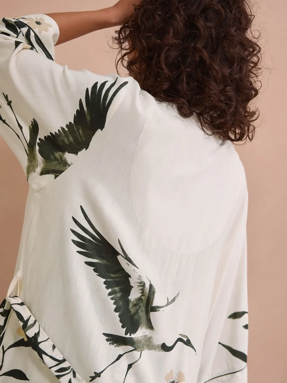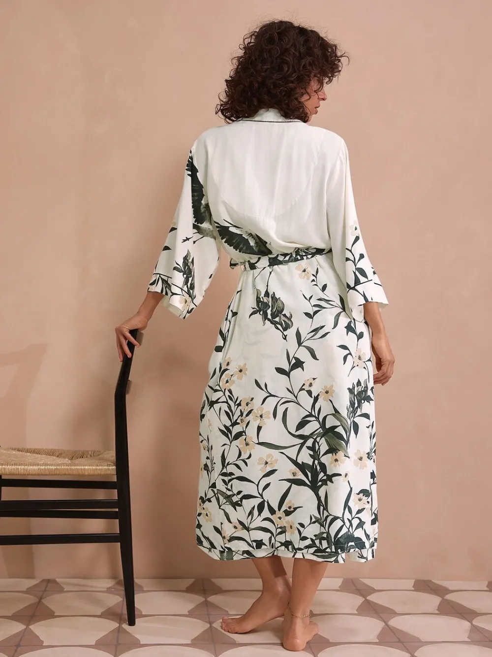 Comfortable, lightweight and elegant, this dressing gown features an all-over floral print and a longline shape, with added linen and a tie waist. Ideal for lounging at home or on holiday. Lightweight Longline Added linen Floral print 85% LENZING™ ECOVERO™ Viscose, 15% Linen. Warning: Keep away from fire and flames.