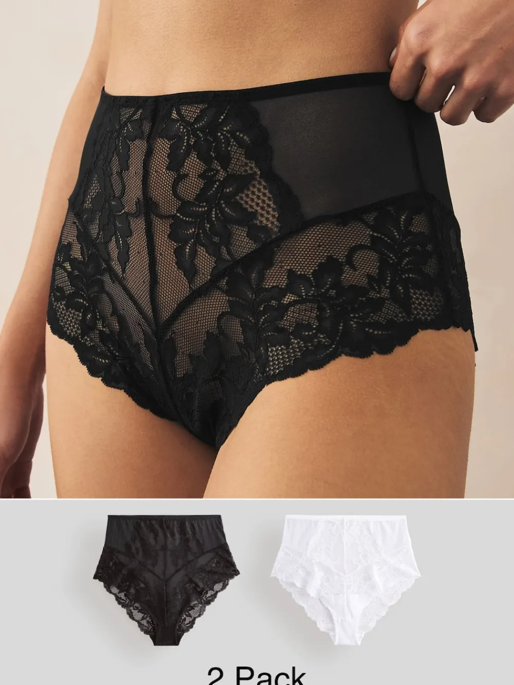 Stock up on your underwear staples with this 2-pack of classic knickers, featuring. High waist High-cut leg Finished with intricate lace detailing Machine washable. 2 x Knickers Main 50% Nylon, 36% Recycled Nylon, 14% Elastane. Gusset 100% Cotton. Items with the curve logo are available in sizes 18 and above.