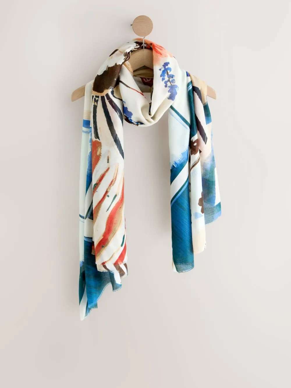 Add an artistic touch to your ensemble with this striking lightweight scarf. Featuring an eye-catching abstract print in beautiful blue, white, and rust tones, it offers a sophisticated way to accessorise. The fine, smooth fabric makes it perfect for adding a pop of colour and warmth without the bulk. Lightweight fabric base Abstract blue and multi-tonal print Versatile styling accessory Length 180cm Width 70cm 100% Recycled polyester.