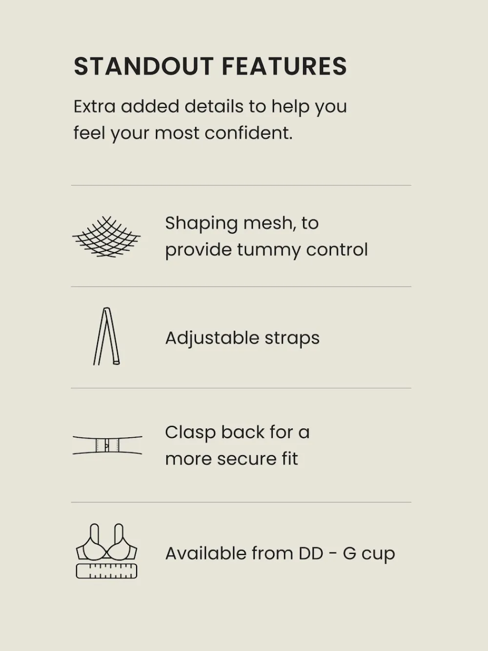 | Size | 32DDD, 32E, 32G, 32H, 32I, 34DDD, 34E, 34G |