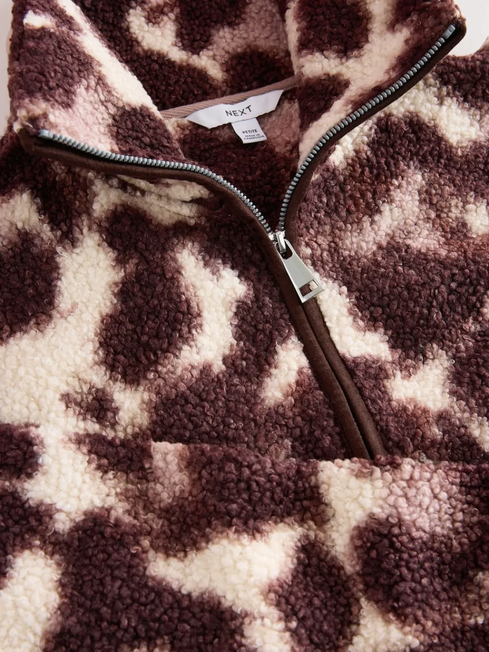 Next Chocolate Brown/Pink Leopard Soft Touch Cosy Teddy Borg Quarter Zip Fleece Outlet
