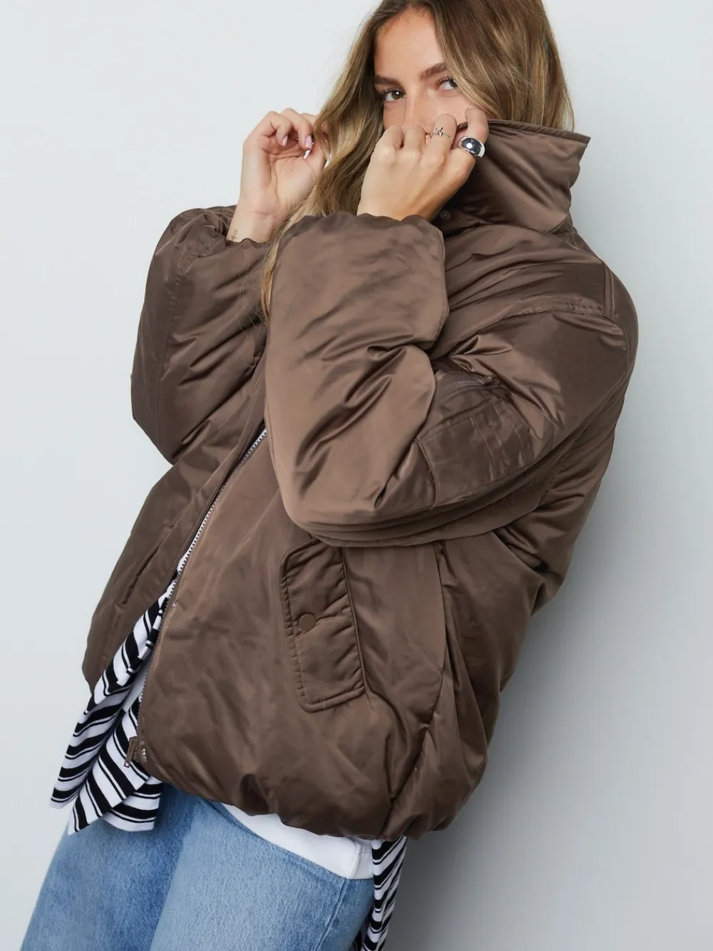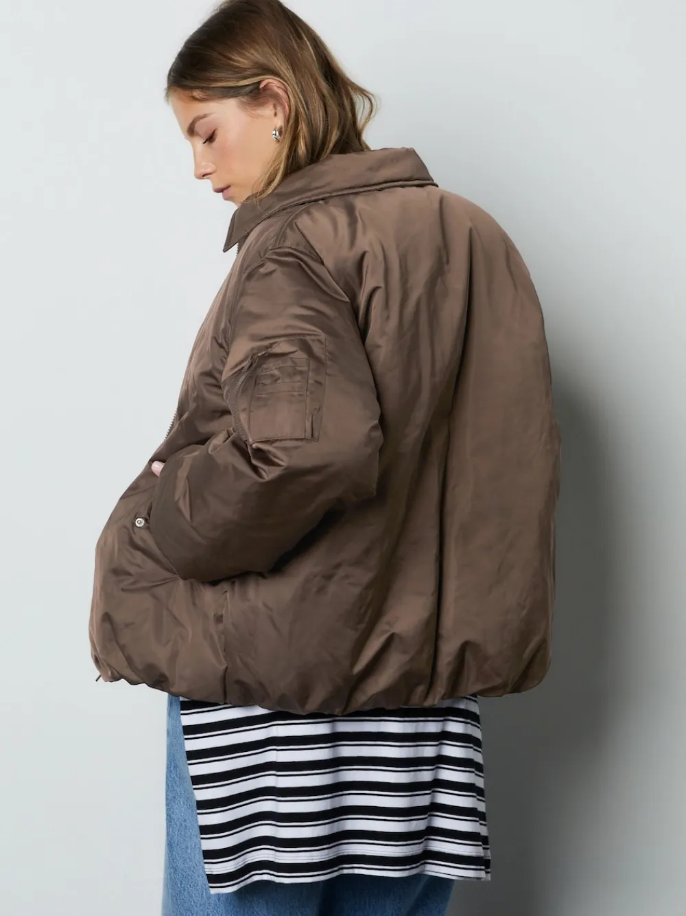 This timeless chocolate brown bomber jacket is a functional spring staple. The casual fit and classic collar are paired with a shower-resistant shell for protection, featuring plenty of pockets, including a zipped sleeve pocket, for added utility. Shower resistant shell Zipped pocket on sleeve Front pockets Zip and popper fastening Regular centre back neck to hem 27″ / 68cm. Main 100% Recycled polyester. Lining 100% Recycled polyester. Sleeve Lining 100% Recycled polyester. Wadding 100% Recycled polyester.