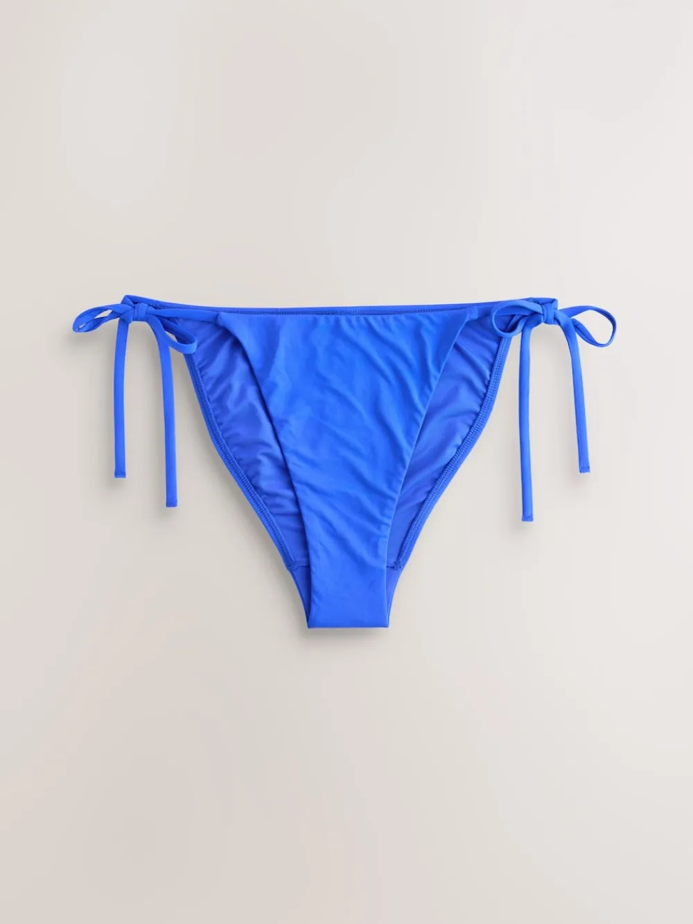 Get beach-ready in our cobalt blue bikini bottoms. Featuring a tie side design and a high leg cut for a flattering fit, these bright blue bottoms are complete with SPF 50+ coated fabric to keep you protected from the sun. High leg shape Tie side fastening SPF 50+ coated fabric Matching bikini top available Main 85% Recycled polyester, 15% LYCRA® XTRA LIFE™ elastane. Lining 92% Recycled polyester, 8% Elastane. Items with the curve logo are available in sizes 18 and above., LYCRA® XTRA LIFE™ fibre keeps your underwear looking new for longer, with lasting comfort and fit. This innovative stretch fabric is lightweight and breathable and will hold its shape wear after wear, wash after wash. , This fabric complies with BS EN 13758 – 1, providing protection against solar ultraviolet radiation. It has been independently tested and given a UPF rating of 50+ which blocks more than 97.5% of UV rays. Important Advice: • Sun exposure causes skin damage • Only covered areas are protected • Always use a high protection factor sunscreen on any exposed areas of skin • The protection offered by this fabric may be reduced with use or if stretched or wet • Always rinse in fresh water after each use • Fabric provides UVA +UVB protection from the sun.