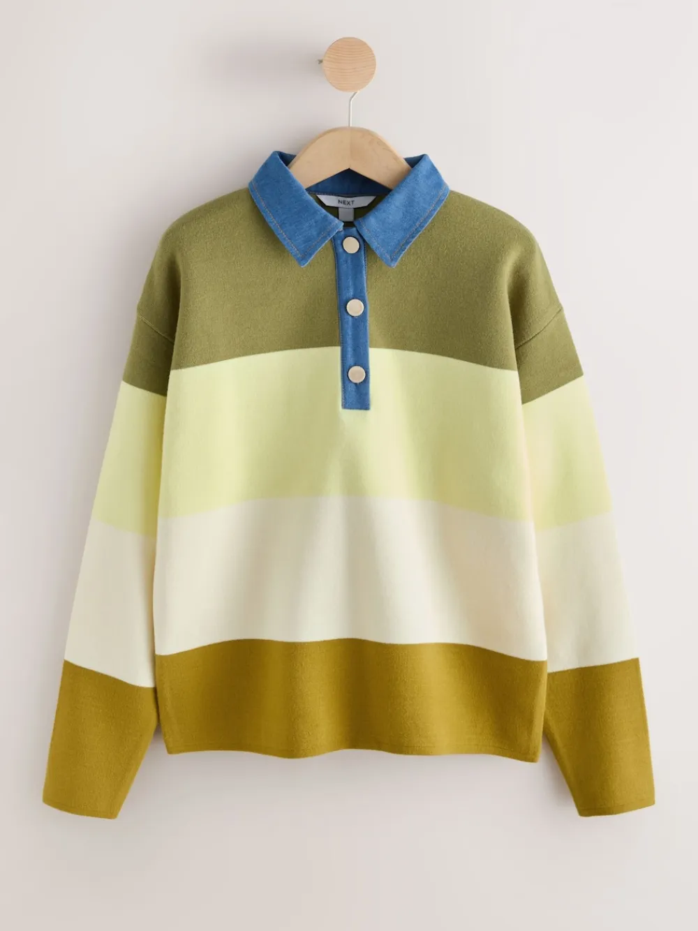 Next Cosy Soft Touch Long Sleeve Polo Neck Jumper Top Green Stripe Denim Collar Clearance