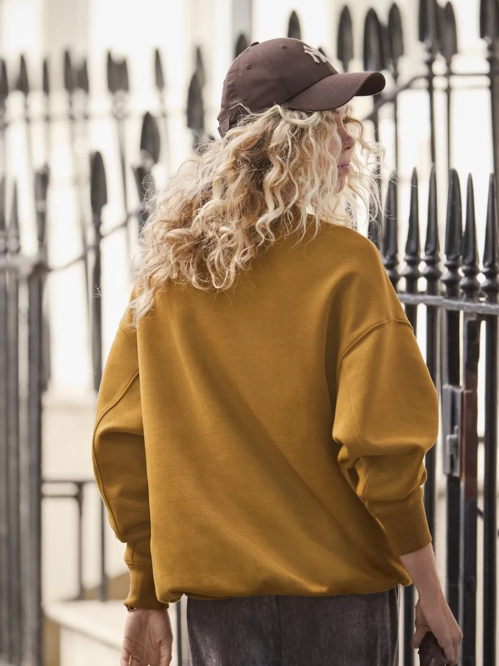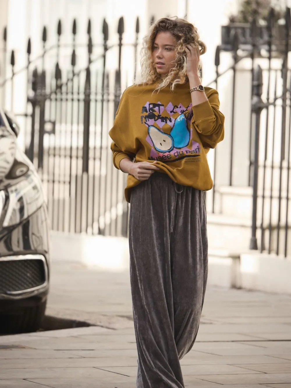 Make a statement with this art-inspired sweatshirt in olive green. The cotton-rich fabric offers a comfortable feel, while the eye-catching fruit graphic and bold text create a modern look. A perfect choice for adding a touch of creative flair to your casual wardrobe. Cotton-rich Fruit art graphic Crew neck Long sleeves Ribbed cuffs and hem Machine washable. 70% Cotton, 30% Recycled polyester.