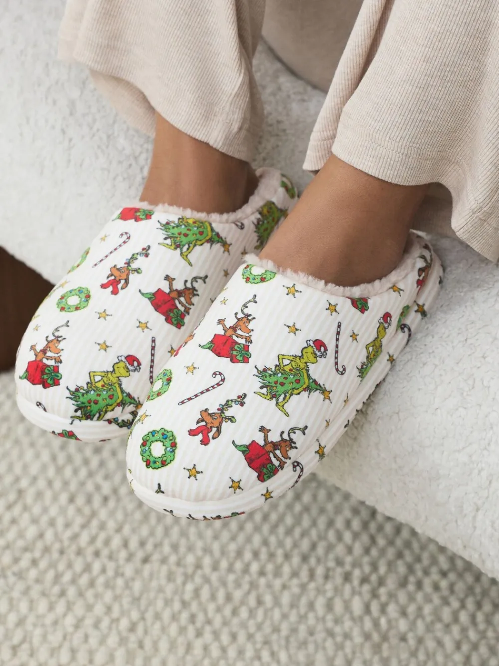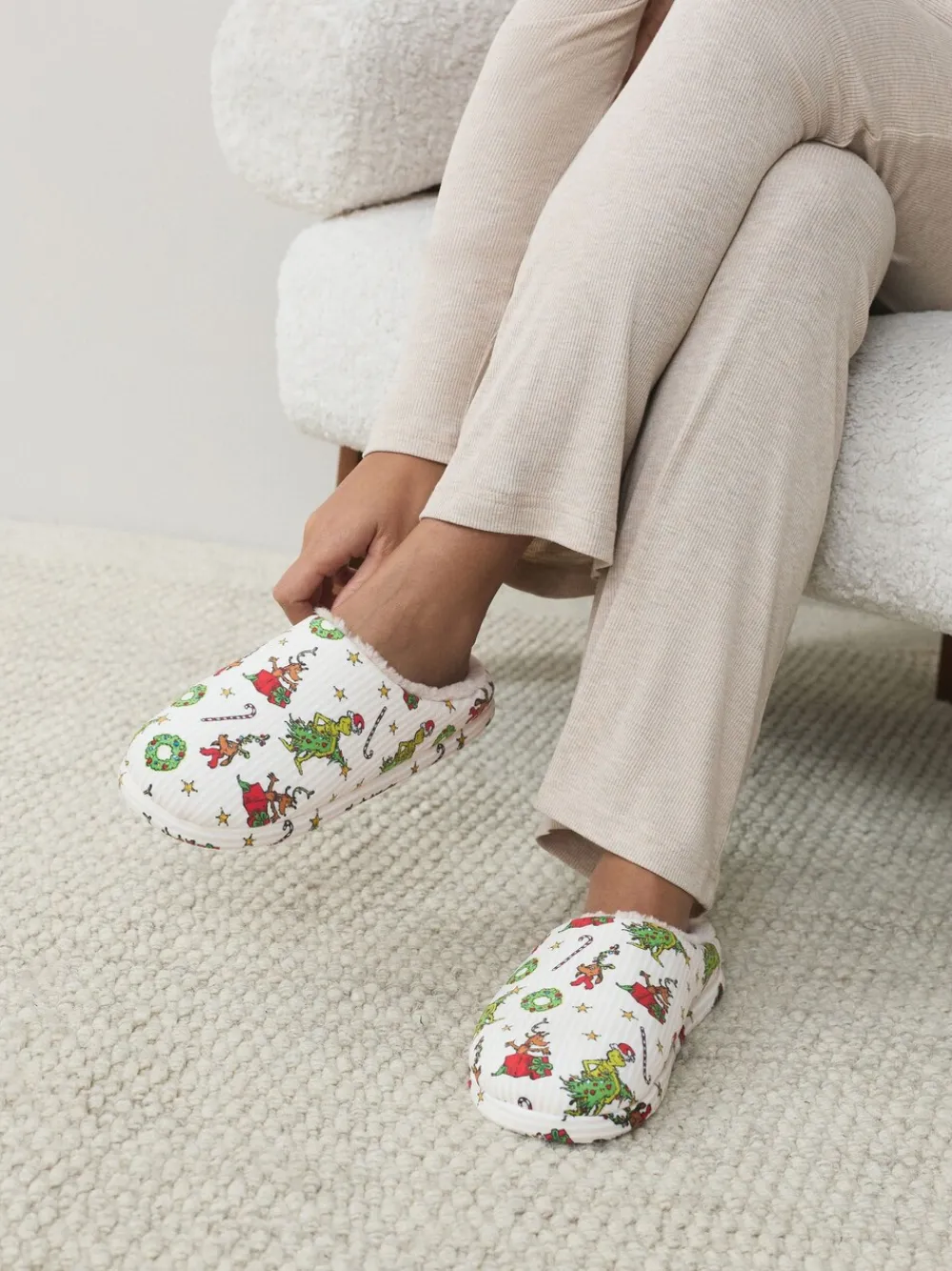 Slide into festive comfort with these cosy mule slippers, perfect for relaxing at home during Christmas. Featuring a playful all-over Grinch pattern and a soft, warm faux fur lining, these slippers complete your comfortable look. They are part of the matching family collection. Mule slippers All over Grinch pattern Faux fur lined Available in matching pyjamas Christmas Matching Family Upper – Textile, Lining & Sock – Textile, Sole – Textile, Other Materials.