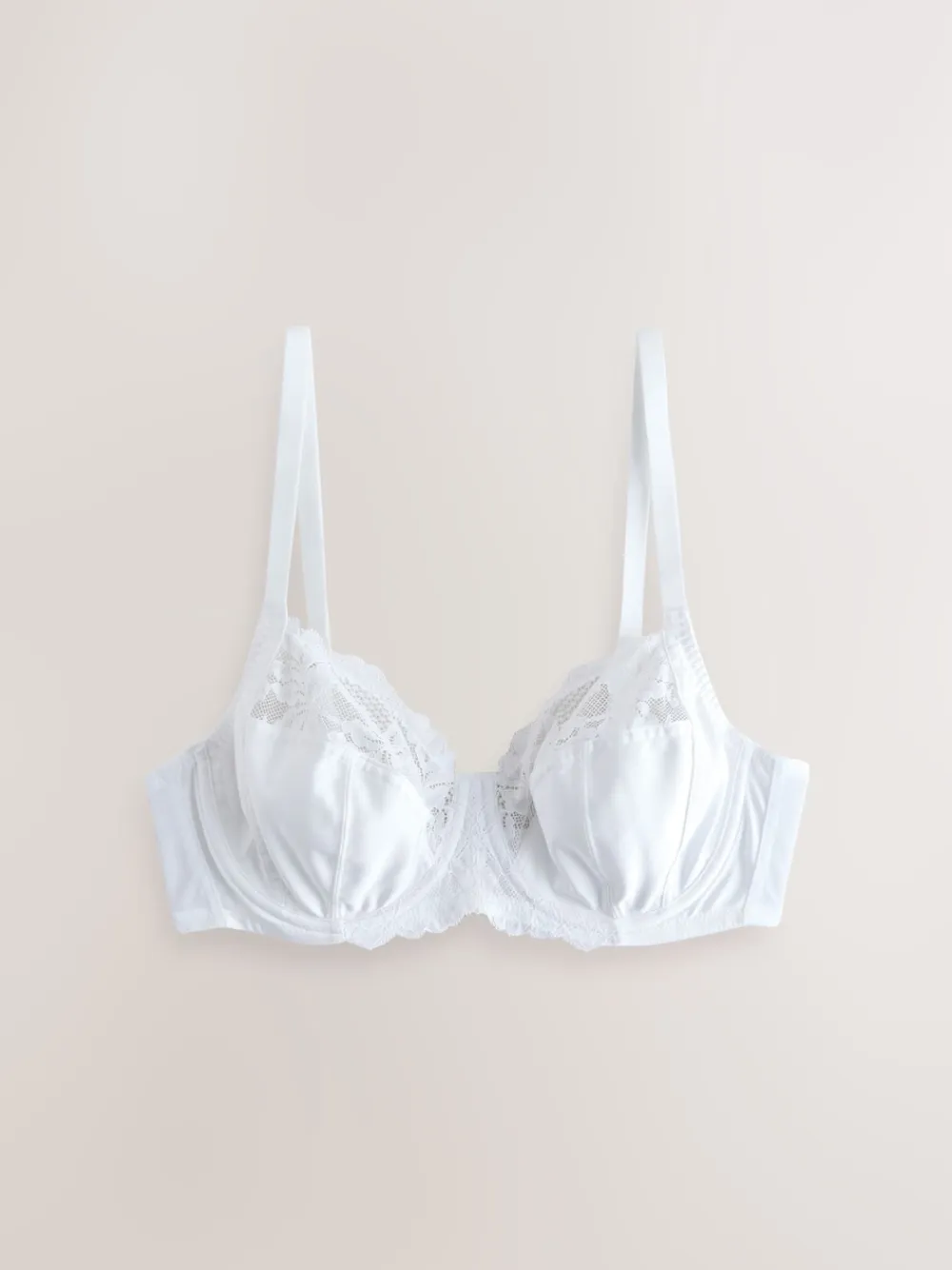 Stock up on support and elegance with this essential three-pack of non-padded full cup bras. Designed for a DD+ fit, they feature soft, supportive cups with beautiful delicate lace trim and practical side support for a comfortable, flattering lift. The pack includes versatile black, white, and praline nude. 3 pack of full cup bras Soft, supportive non-padded cups Delicate lace trim detailing Designed with side support Machine washable. 3 x Bra 84% Nylon, 16% Elastane.