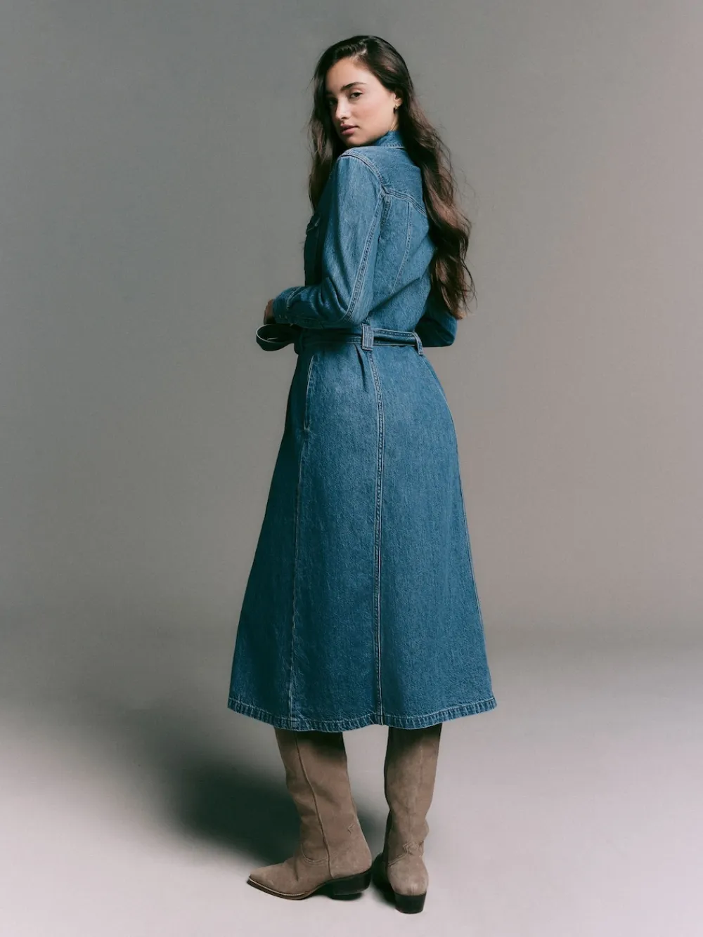 This classic denim shirt dress offers a timeless silhouette, effortless styling and all day comfort. The adjustable belt and press stud fastening provides easy dressing, with flattering seam details and a midi length. Pair with your favourite boots or trainers for a perfect transitional look. Machine washable. 100% Cotton. Items with the curve logo are available in sizes 18 and above., Our tall collection is designed to fit women 5’10” and above. This has been proportionally increased through the body, leg and sleeve to achieve the perfect fit. Available in sizes 8-20.